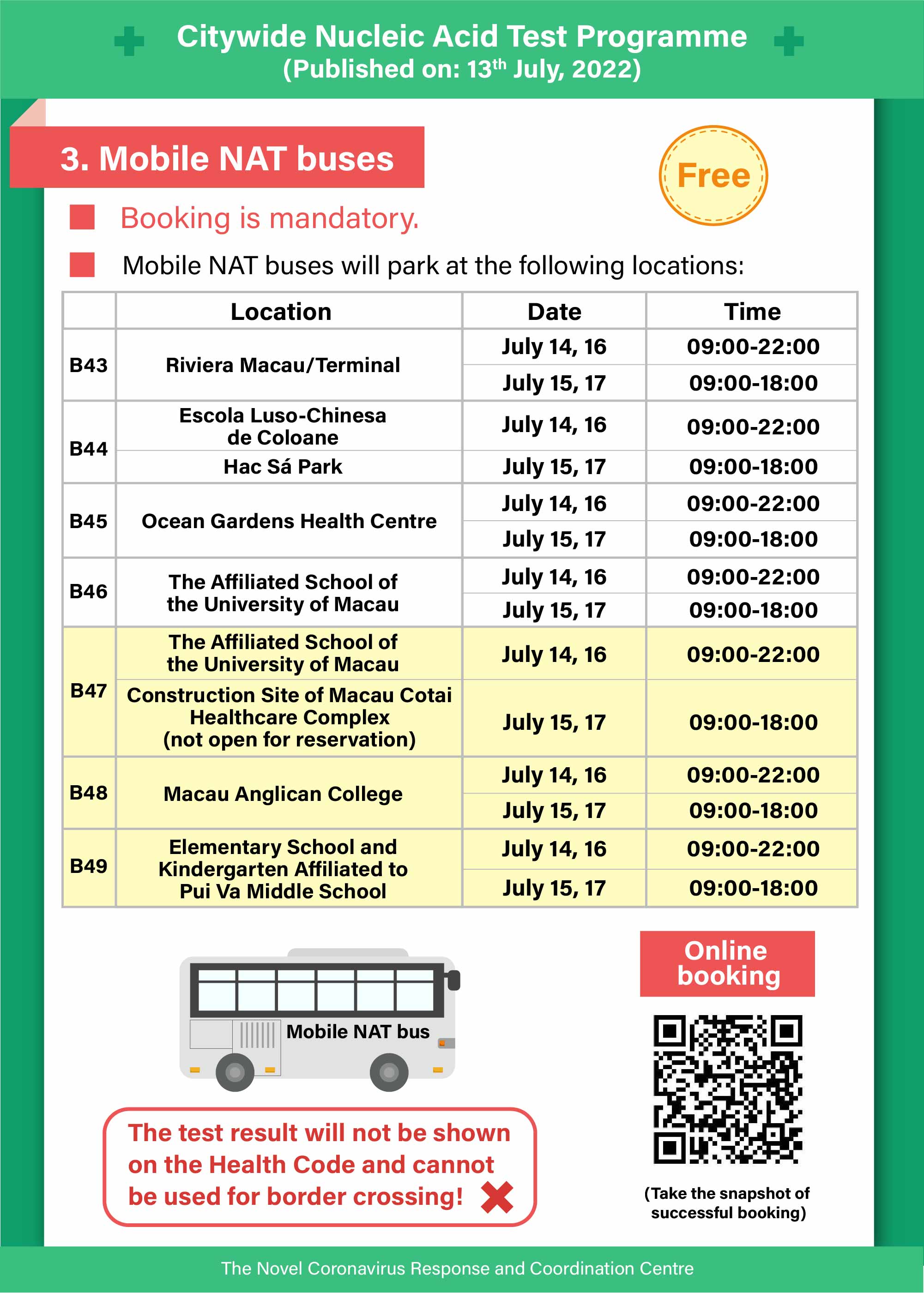 Location and time arrangement for the 2 additional mobile NAT buses: The first bus (B48) will park at Macau Anglican College (Beco da Baía, Taipa); the second bus (B49) will park at Escola Secundaria Pui Va Seccao Primaria E Infantil (Rua do Minho No. 93, Taipa); both buses operate from 09:00 to 22:00 on 14 July, and from 09:00 to 18:00 on 15 July. Besides, the service locations of bus B47 will be changed to the Affiliated School of the University of Macau on 14 July (open to the public), and the construction site of Islands District Health Services Complex on 15 July (only for workers staying inside the site, no advance booking is available).