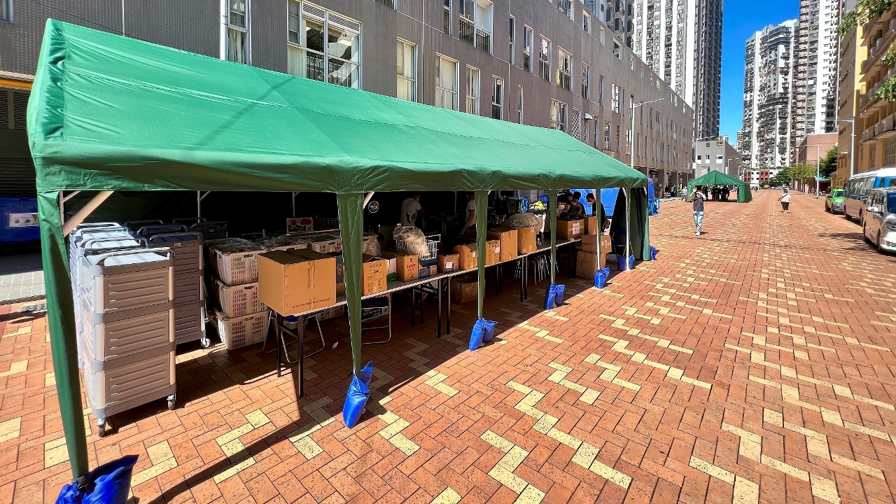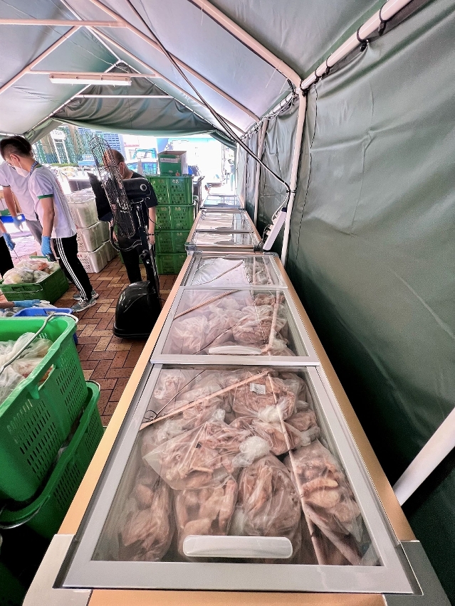 To ensure the safety and hygiene of the delivery of vegetables and frozen meat food packs, canopy tents are set up in the support stations of each Red Code Zone. They are equipped with freezers with freezing temperature that meets food safety requirements for the temporary storage of frozen meat. In addition, after passing the inspection, each frozen meat pack is distributed to the Red Code Zones by the suppliers in refrigerated vehicles and immediately stored in the freezers. In accordance with food safety and hygiene requirements, the staff only take the frozen meat packs out from the freezers before entering the Red Code buildings for delivery, so as to minimise the delivery time as far as possible to prevent them from thawing.