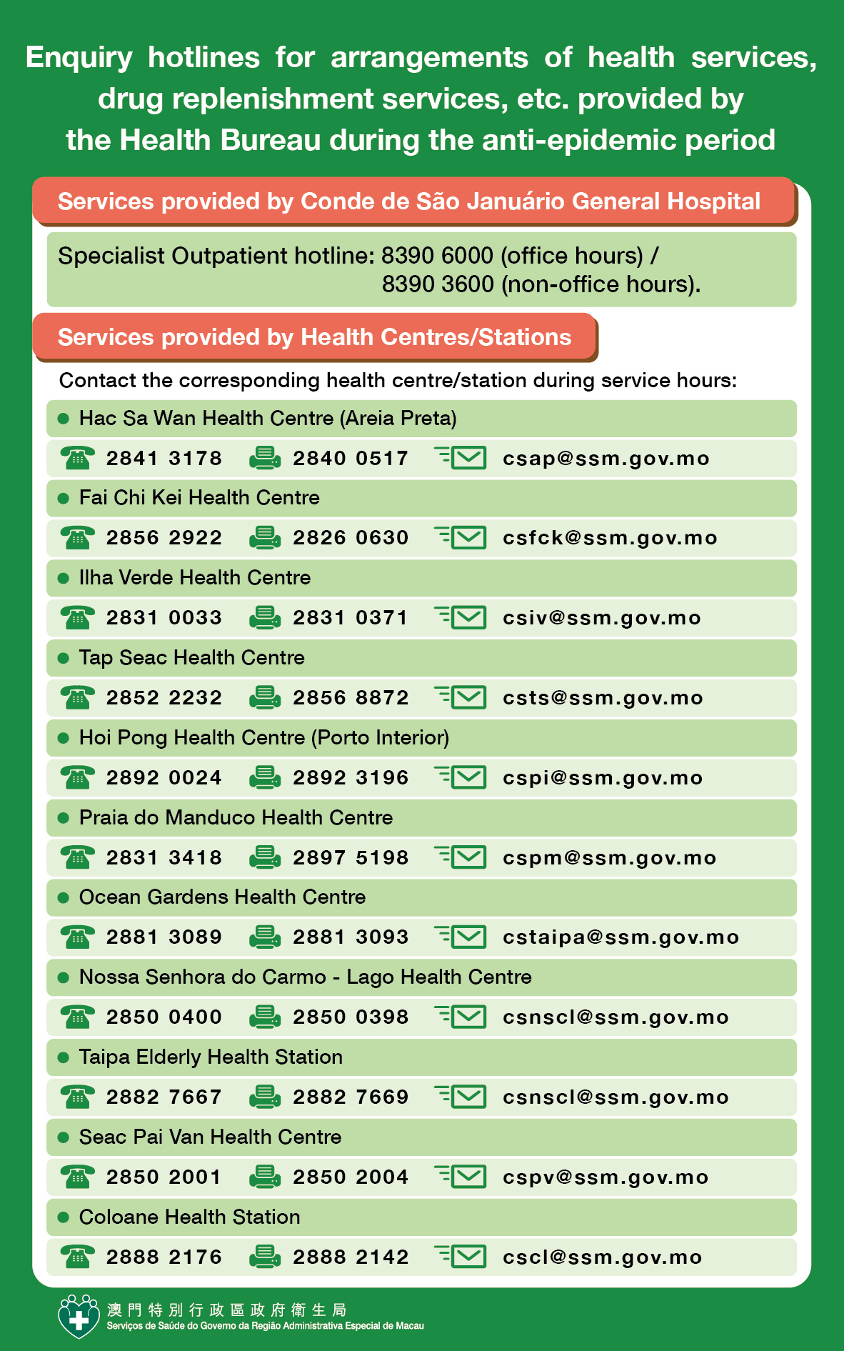 For enquiries, members of the public may contact relevant health centres during office hours: Fai Chi Kei Health Centre (2856 2922), Hac Sa Wan Health Centre (2841 3178), Ilha Verde Health Centre (2831 0033), Tap Seac Health Centre (2852 2232), Praia do Manduco Health Centre (2831 3418), Hoi Pong Health Centre (2892 0024), Nossa Senhora do Carmo - Lago Health Centre (2850 0400), Ocean Gardens Health Centre (2881 3089), Seac Pai Van Health Centre (2850 2001), Coloane Health Station (2888 2176).