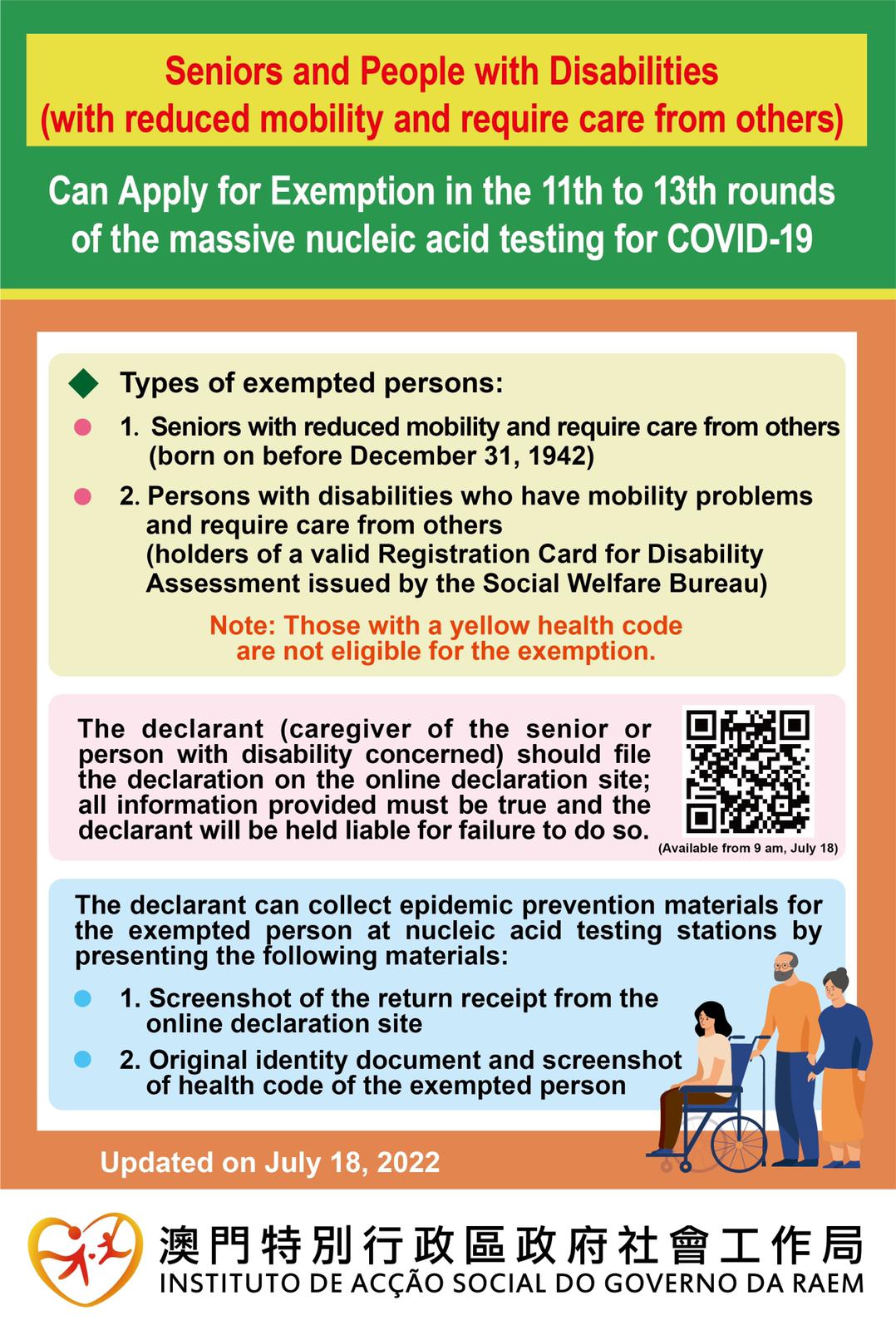 seniors and persons with disabilities who are able to move freely must undergo the city-wide nucleic acid tests; ; only those seniors or disabled persons with mobility difficulties and require the assistance of others are eligible for the exemption from the 11th to 13th round Citywide Nucleic Acid Test. All residents bearing yellow Health Code are not entitled to the exemption.