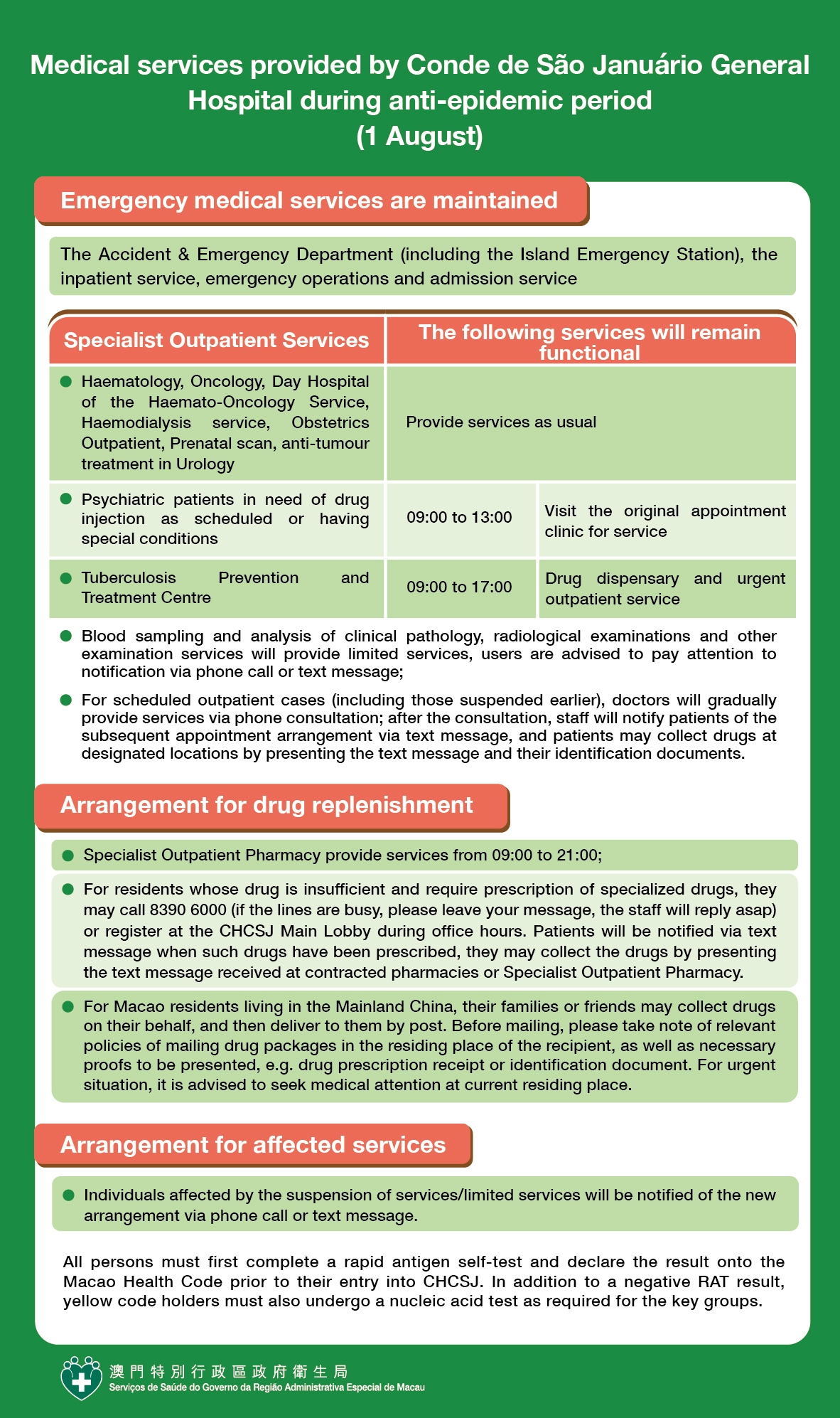 To cooperate with the anti-epidemic measures of the MSAR Government during the consolidation period, the health services, drug replenishment and other services of the Conde de São Januário General Hospital, Health Centres and Health Stations on 1 August are arranged as follows: