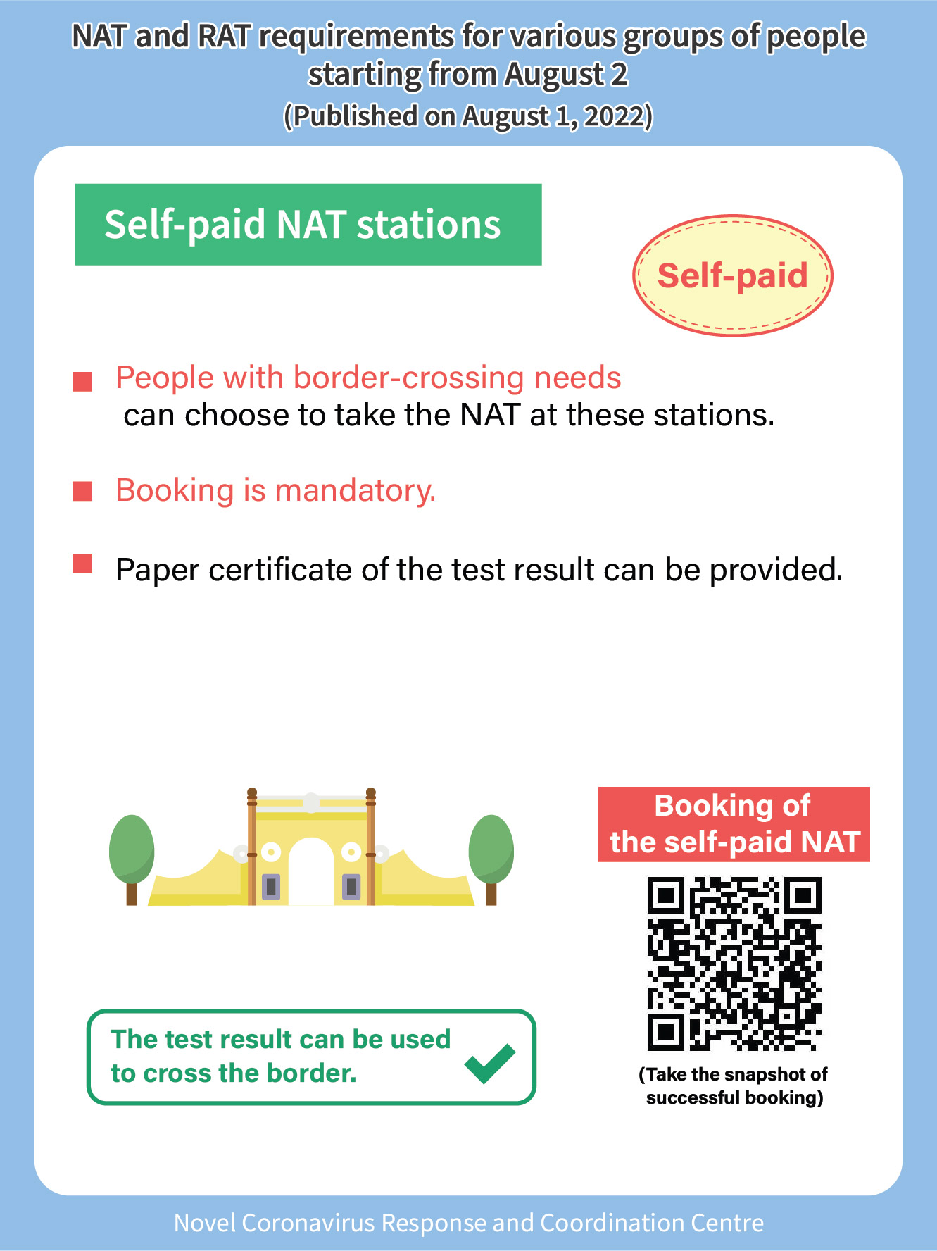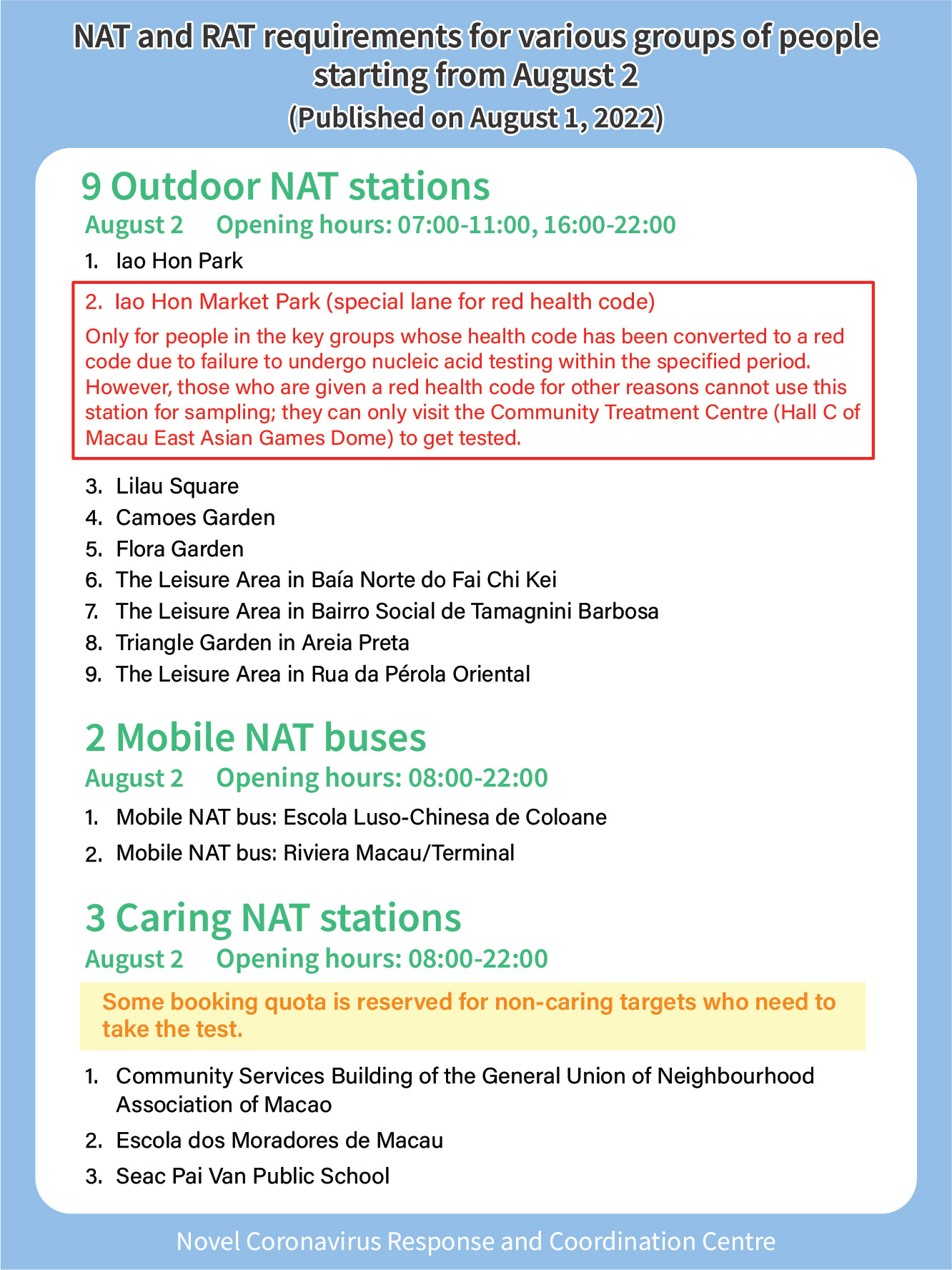 The Novel Coronavirus Response and Coordination Centre announces that after risk analysis, starting tomorrow (2 August, Tuesday), the nucleic acid testing (NAT) arrangement for key groups and those who need to leave home for work will be adjusted as follows: