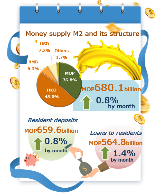 Currency in circulation and demand deposits grew 1.1% and 2.5% respectively. M1 thus increased 2.1% from one month earlier. Meanwhile, quasi-monetary liabilities rose 0.7%. The sum of these two items, i.e. M2, grew 0.8% to MOP680.1 billion. On an annual basis, M1 and M2 fell 4.2% and 2.2% respectively. The shares of pataca (MOP), Hong Kong dollar (HKD), renminbi (RMB) and United States dollar (USD) in M2 were 36.8%, 48.0%, 6.3% and 7.2% respectively.
