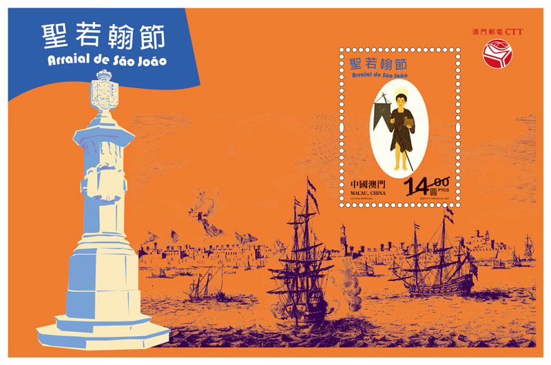 This issue includes a set of two stamps and one souvenir sheet. The stamps, with bright and vivid colours, illustrate the Feast of Saint John held at Calçada da Igreja de São Lázaro, the Portuguese-style building with colourful flags, food and drinks, and musical performances, showing the Portuguese and Macanese cultures. The souvenir sheet highlights the statue of Saint John the Baptist placed at the Municipal Affairs Bureau, the image of Macao city in 1622 and the Victory Monument at Victory Garden, representing the origin of this festivity.