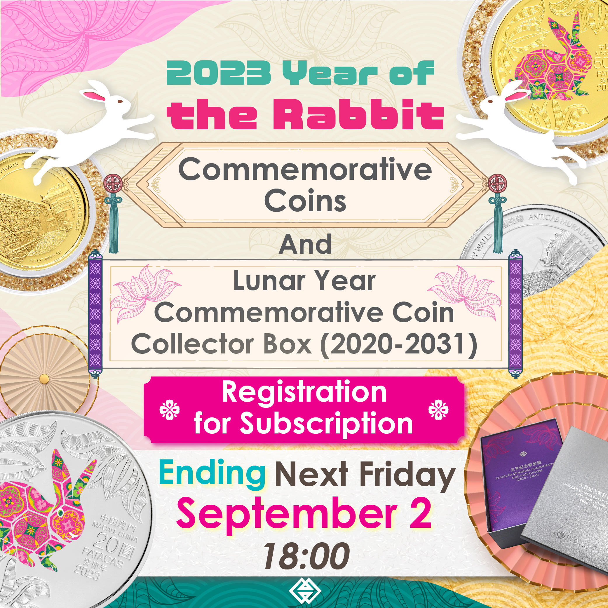 The online subscription period for the 2023 Year of the Rabbit commemorative coins and Lunar Year Commemorative Coin Collector Box (2020-2031) will end at 6:00pm on 2 September 2022 (next Friday). Hence, AMCM would like to remind Macao residents who are interested in subscribing for the said coins and collector box to complete the online subscription process ( https://www.amcm.gov.mo/static/COCSCollection_2022/terms_pt.html ) before the mentioned deadline. A service counter has also been set up at the lobby of AMCM during the mentioned period to provide registration service for those who require assistance. For enquiries, please visit our webpage or call our hotline at 28565071 or 28565072.