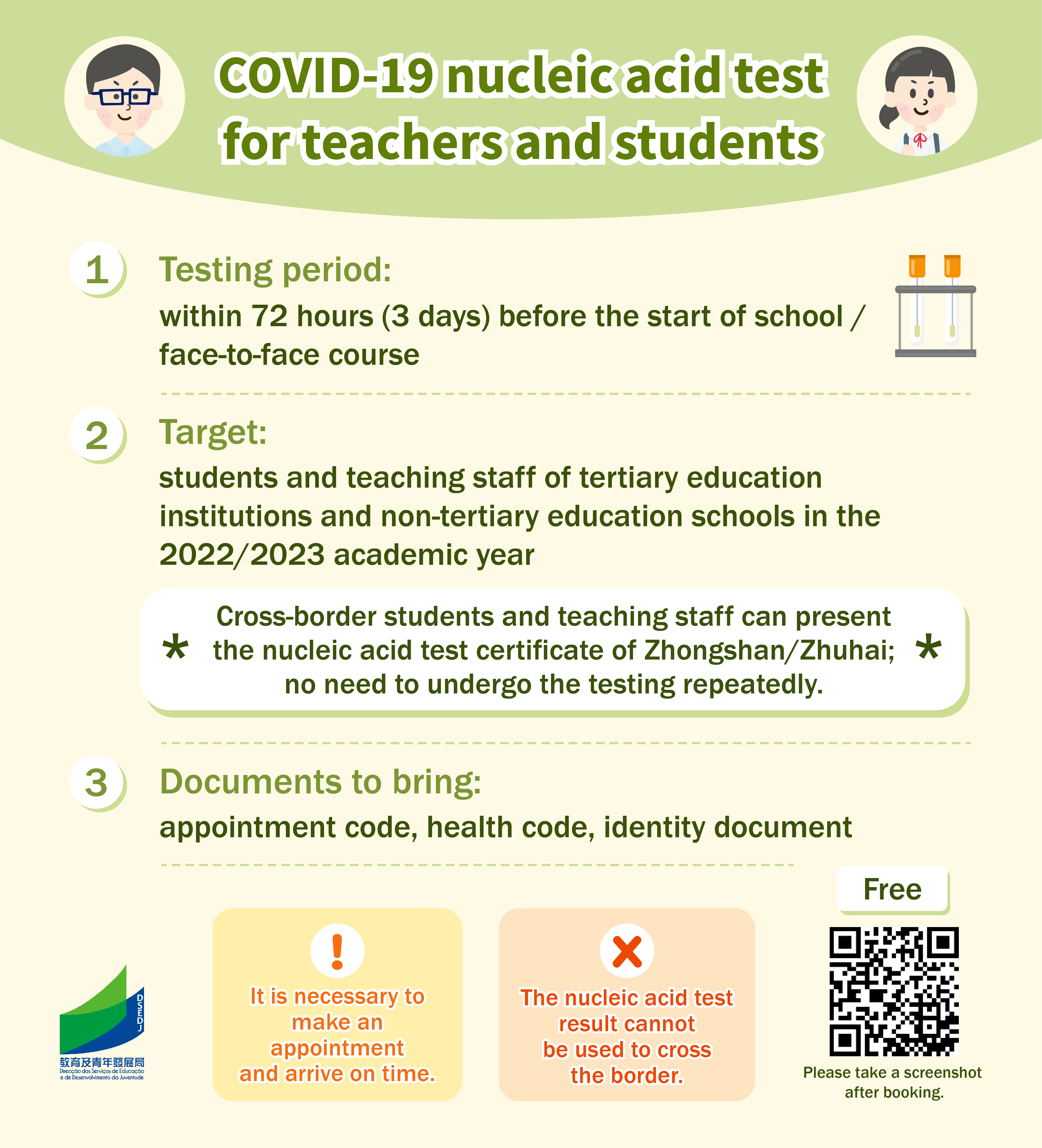 In order to ensure the health and safety of teachers and students, the DSEDJ announced in early August that students and teaching staff of tertiary education institutions and non-tertiary education schools were required to return to their usual place of residence (Macao, Zhuhai or Zhongshan) 10 days before the first day of the new academic year. They also have to present a nucleic acid test certificate within 72 hours (3 days) on the school opening day. In order to facilitate their booking for the test, "COVID-19 Nucleic Acid Test Booking System for Teachers and Students" ( https://app.ssm.gov.mo/studentrnabook ) has been opened. It is necessary for all teachers and students to make an appointment in advance. It is suggested that they should not arrive the test station too early (over 30 minutes earlier) or too late to avoid big crowds. The test result cannot be used to cross the border, nor can it be used as regular testing for key working groups. Cross-border students and teaching staff only need to undergo a nucleic acid test in Zhuhai or Zhongshan; there is no need for them to come back to Macao to do the test again. In addition, faculty and students of tertiary education institutions and teaching staff of non-tertiary education schools have to present to the institution or school a certificate of completion of the entire course of vaccination against COVID-19, or show a proof of negative result of nucleic acid test for COVID-19 within 7 days every week.