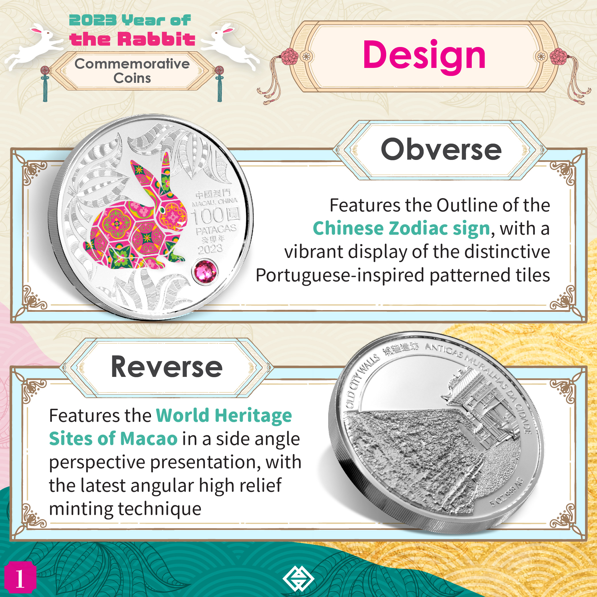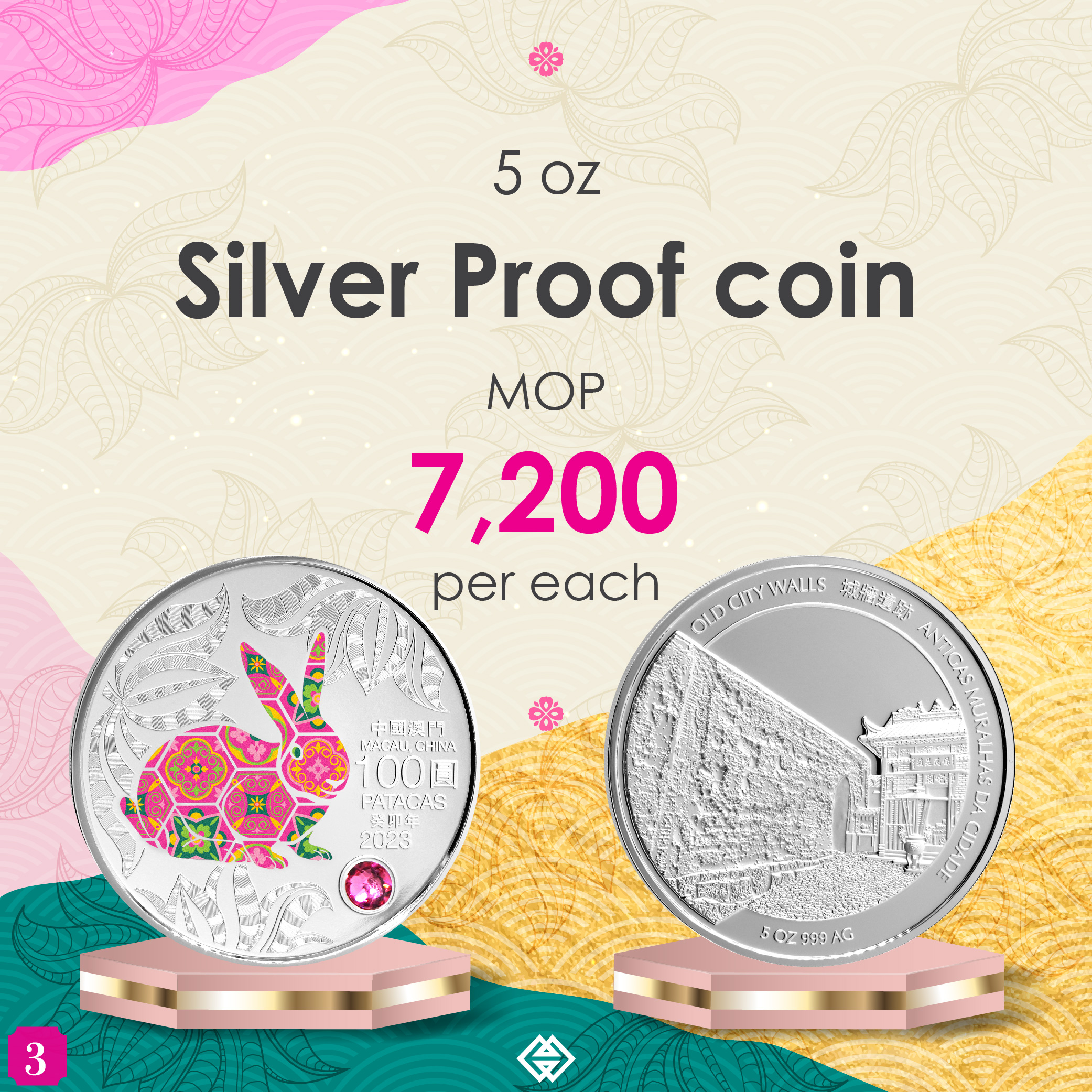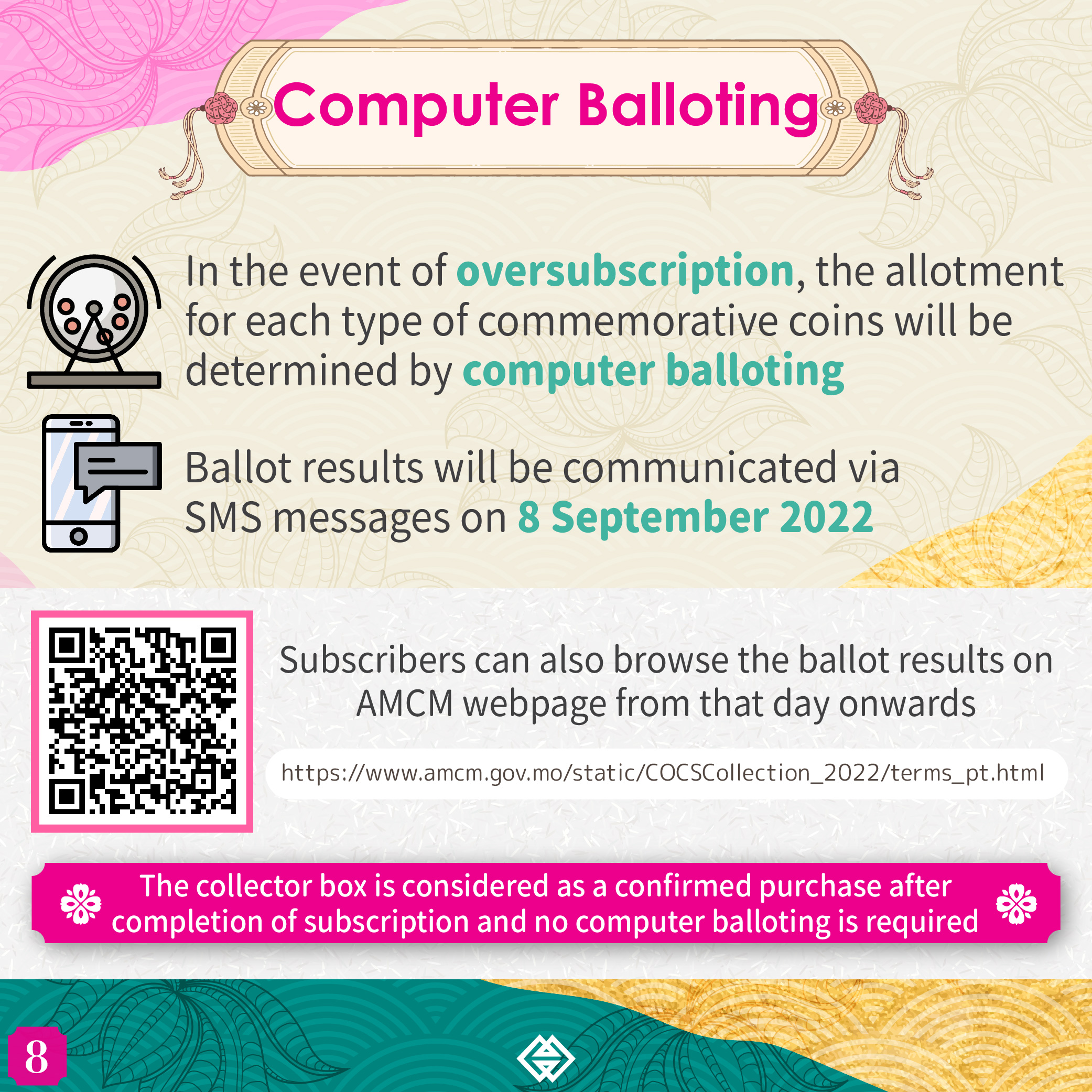 The Rabbit commemorative coins comprise a 1 oz Silver Proof Coin, a 5 oz Silver Proof Coin and a 0.5 oz Gold Proof Coin. In the event of oversubscription, the allotment for each type of commemorative coins will be determined by computer balloting. The ballot results will be communicated via SMS messages on 8 September 2022. Subscribers can also browse the ballot results on the webpage of AMCM from that day onwards (https://www.amcm.gov.mo/static/COCSCollection_2022/terms_pt.html). Meanwhile, the collector box is considered as a confirmed purchase after completion of subscription and no computer balloting is required.
