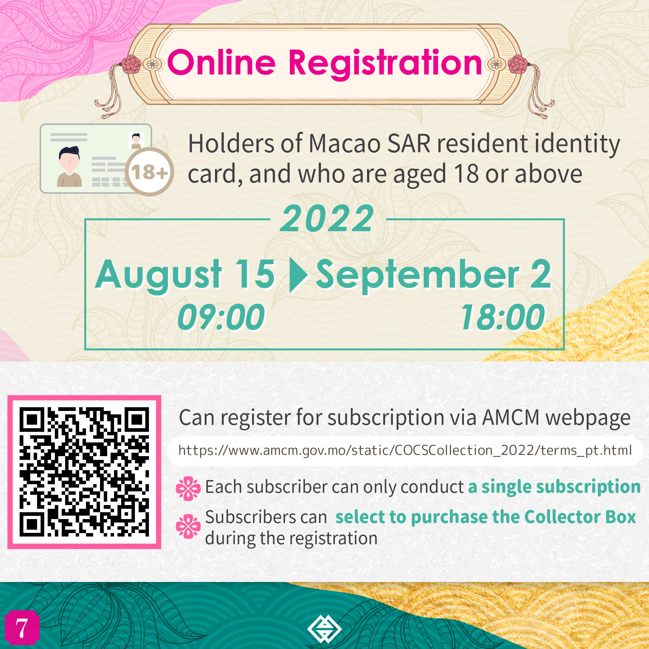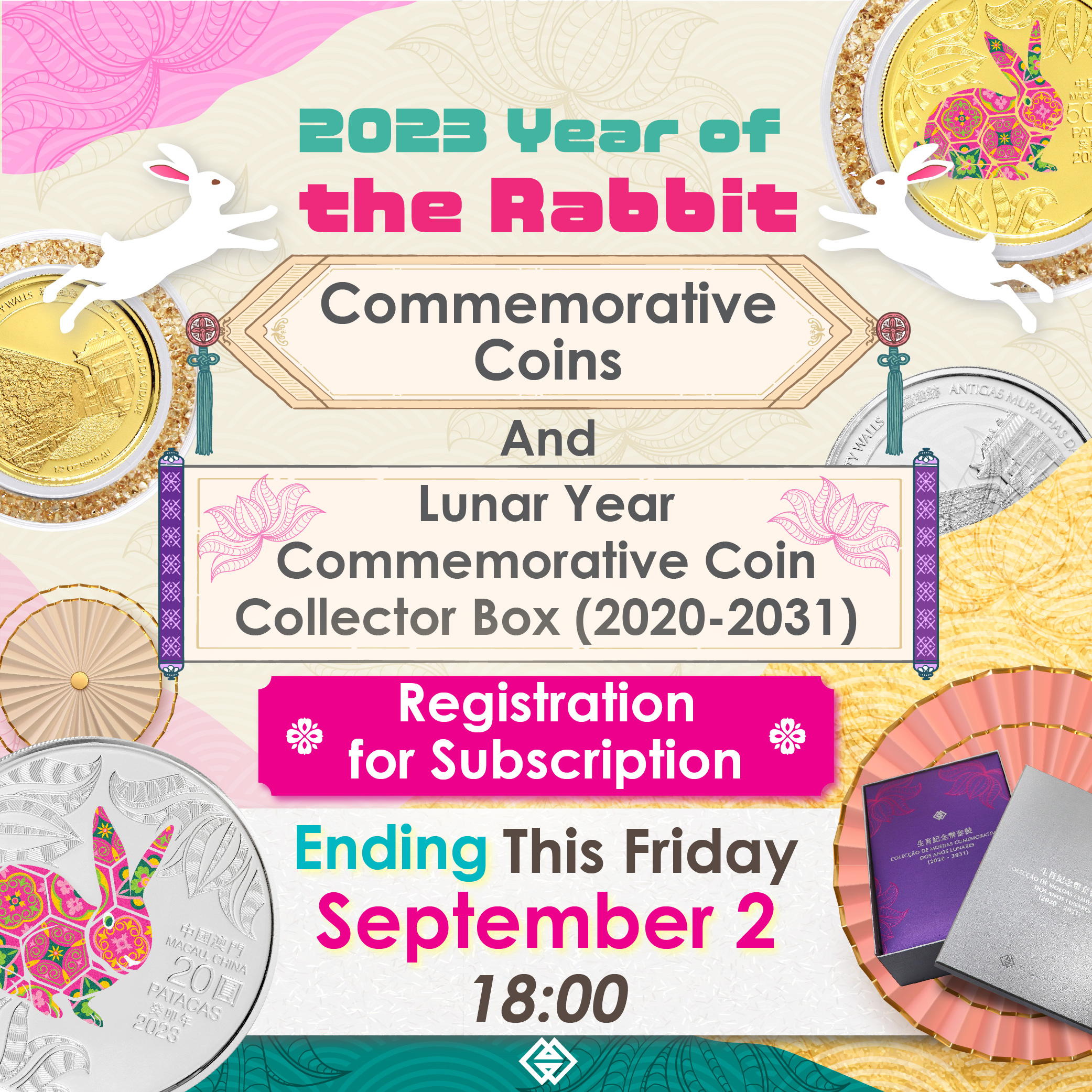 The online subscription period for the 2023 Year of the Rabbit commemorative coins and Lunar Year Commemorative Coin Collector Box (2020-2031) will end at 6:00pm on 2 September 2022 (Friday). AMCM would like to remind Macao residents who are interested in subscribing for the said coins and collector box to complete the online subscription process before the mentioned deadline.