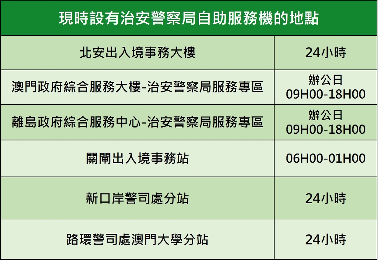 To facilitate the use of the relevant services by non-resident workers, the number of self-service kiosks locations will be gradually increased in the near future, especially considering 24-hour operating facilities, so as to further enhance convenience and avoid the constraints of the general public sector service hours. At present, the service targets include students studying in tertiary institutions in Macao and non-resident workers. We will continue to expand the applications and functions of the self-service kiosks so that a wider range of people who need to process various formalities at this Force can enjoy a more diverse and convenient service.
