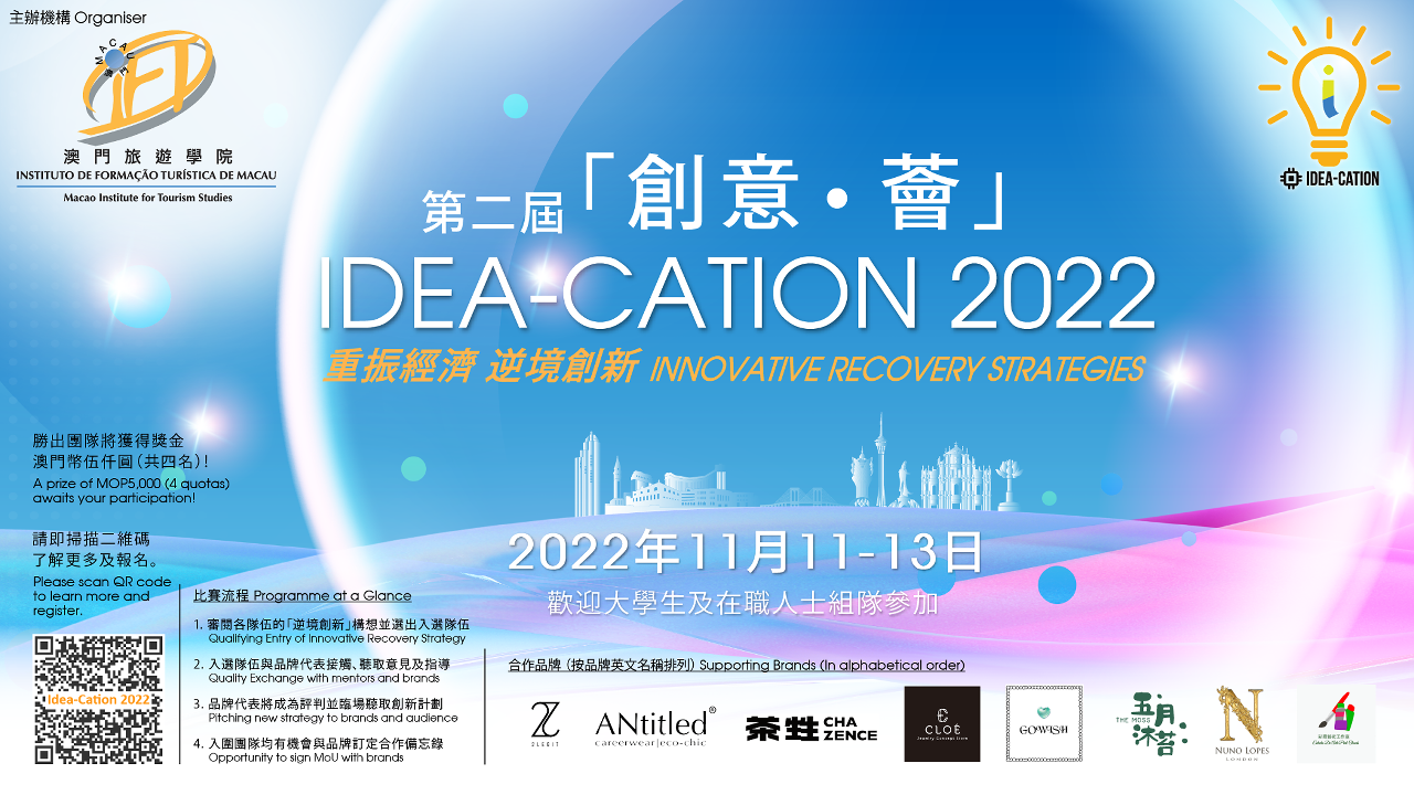 Idea-cation @ IFTM gathers talents to build a platform for innovation and creativity, with the aim of helping the tourism industry seek new business opportunities and find innovative and viable solutions. Following last year’s success, this second edition calls for community input on innovative recovery strategies amidst adversity which can help Macao’s local retail brands to transform or seize new opportunities. Through the hybrid mode event, participants will get to meet entrepreneurial peers, unleash their imagination and enjoy the feeling of accomplishment when successfully pitching innovative ideas to the audience. Industry and academic experts will be invited to be team consultants or judges.