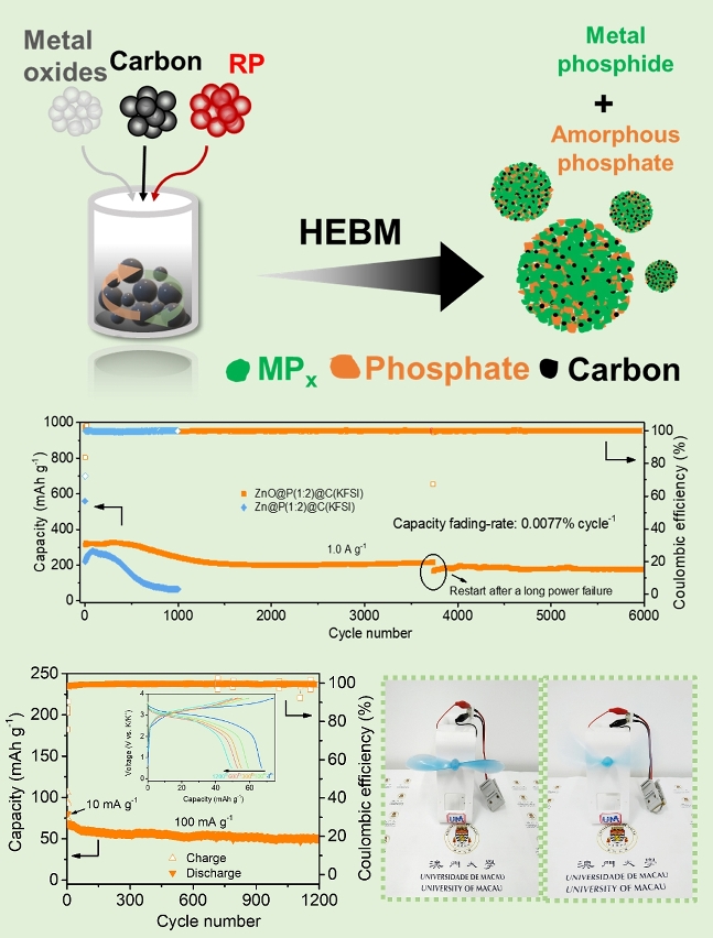 Anode materials are critical to the performance of batteries. Among the many anode materials of potassium-ion batteries, phosphorus and its metal phosphides are favourable competitors for the anode electrodes of the batteries because of their high specific capacity and reasonable discharge voltage. However, these kinds of electrode materials are based on conversion or even alloying reaction mechanisms. They will undergo huge volume changes after cycling and will result in extremely poor cycling stability, which makes it difficult to meet the actual application requirements. In order to solve the abovementioned problems, some solutions, including complicated morphology control and expensive flexible substrates, have been reported, and significant improvements have also been made, but complex and high-cost solutions remain difficult to put into practice. By analysing previous studies, the research team found that the oxidation of phosphorus and its metal phosphides seems to be unavoidable in the synthesis of materials or in the preparation of electrodes. However, phosphide electrodes have a high electrochemical stability and phosphates are susceptible to amorphisation. For this reason, in situ-formed amorphous phosphate impurities can act as buffers to reduce the volume expansion of phosphide electrodes. To this end, the team took a different approach by using metal oxide as the raw material and synthesising amorphous phosphate-doped metal in one step through a simple ball milling method. This in situ-formed amorphous phosphate has a uniform distribution and can be used as a buffer to effectively reduce the volume expansion of the metal phosphide electrode. As a general synthesis strategy, the team synthesised a total of ten metal phosphides (VPx, CrPx, MnPx, FeP, FeP2, FeP4, CoP, NiP3, CuP2, and ZnP2) containing amorphous phosphate-doped metal phosphides. Among them, ZnP2 as a representative was tested and analysed.