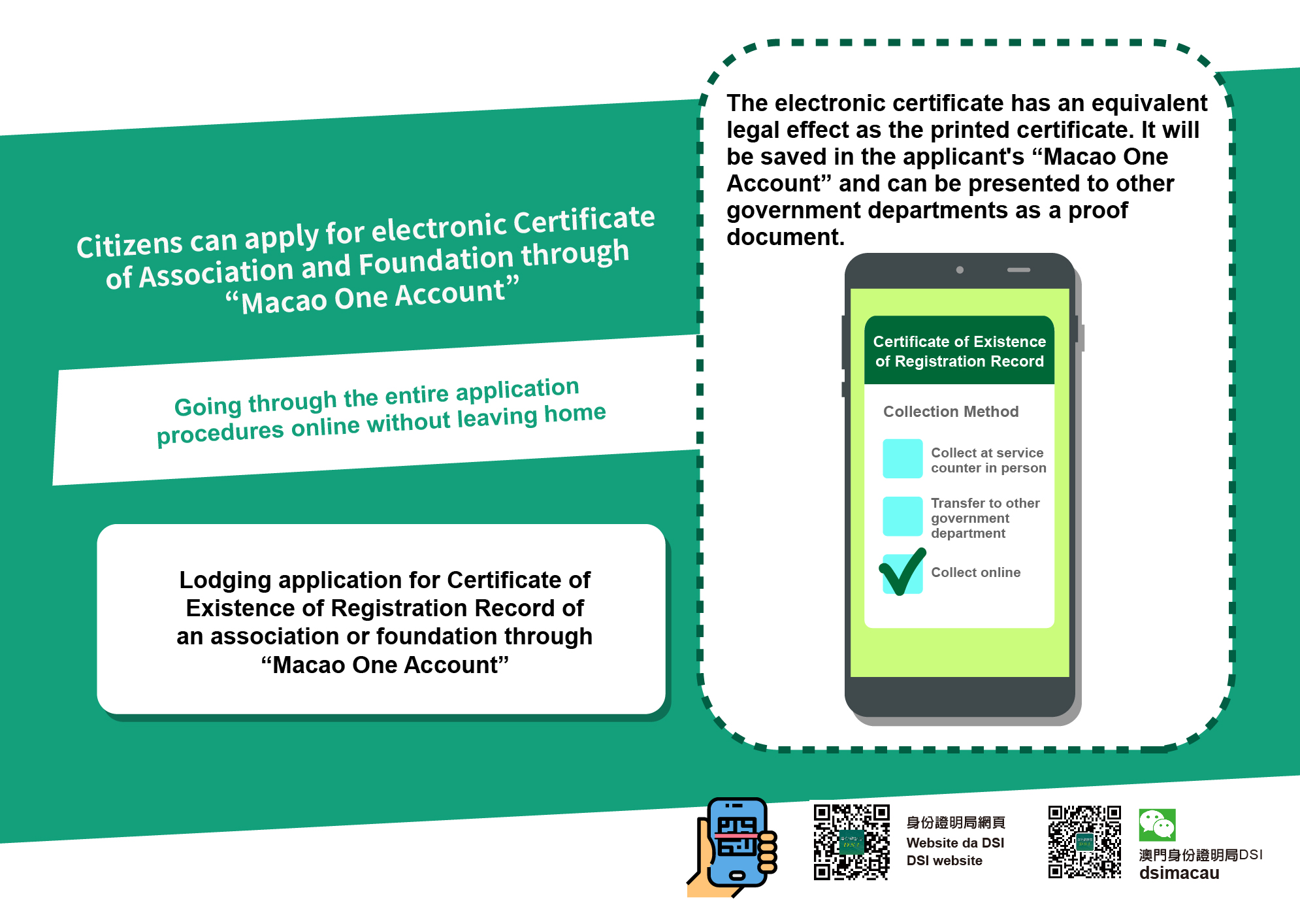 The Identification Services Bureau (DSI) continuously improves online services related to the registration of association and foundation. Starting from 28th September 2022, citizens who lodge the application for the Certificate of Existence of Registration Record of an association or foundation through the “Macao One Account” can choose to receive the certificate in electronic form, which allows citizens to go through the entire application procedures online without leaving home.