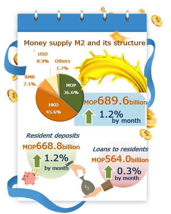 Currency in circulation and demand deposits grew 0.4% and 2.4% respectively. M1 thus increased 1.8% from one month earlier. Meanwhile, quasi-monetary liabilities rose 1.1%. The sum of these two items, i.e. M2, grew 1.2% to MOP689.6 billion. On an annual basis, M1 dropped 3.5% whereas M2 rose 0.4%. The shares of pataca (MOP), Hong Kong dollar (HKD), renminbi (RMB) and United States dollar (USD) in M2 were 36.6%, 45.6%, 7.1% and 8.9% respectively.
