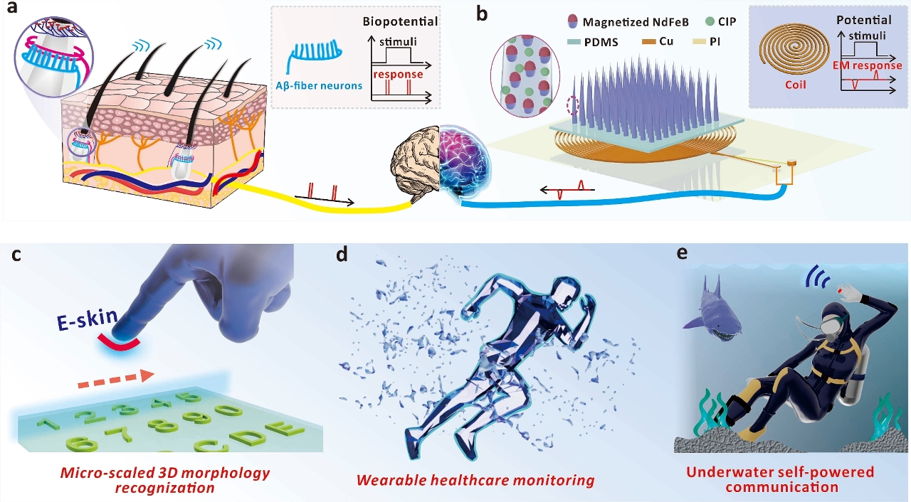 Inspired by human skin, the research team has designed a flexible e-skin consisting of a whisker-like magnetised micro-cilia array (MMCA) and flexible coils. With the built-in alignment of magnetic moments, the mechanical stimuli-induced MMCA deformation can generate related voltage signals within the coils to provide feedback for reflecting the external pressure and surface morphology. The study systematically investigated the relationship between the induced voltage and pressure, and optimised the MMCA to ensure a reliable voltage profile that can quantitatively reflect the 3D information of the surface morphology. By customising the alignment of magnetic moments, the e-skin can further output multiple voltage waveforms as information codes on one device for efficient human-machine interaction and high-capacity transmission. As the perception capability of the e-skin is originated from the electromagnetic response, the e-skin is self-powered and can work stably in harsh conditions such as high temperature or underwater. The study comprehensively shows the strengths of the e-skin in different applications, such as real-time health monitoring (including the recognition of breath status and joint bending), Braille identification, reconstruction of relief information, high-capacity command transmission, and Morse code communication underwater.