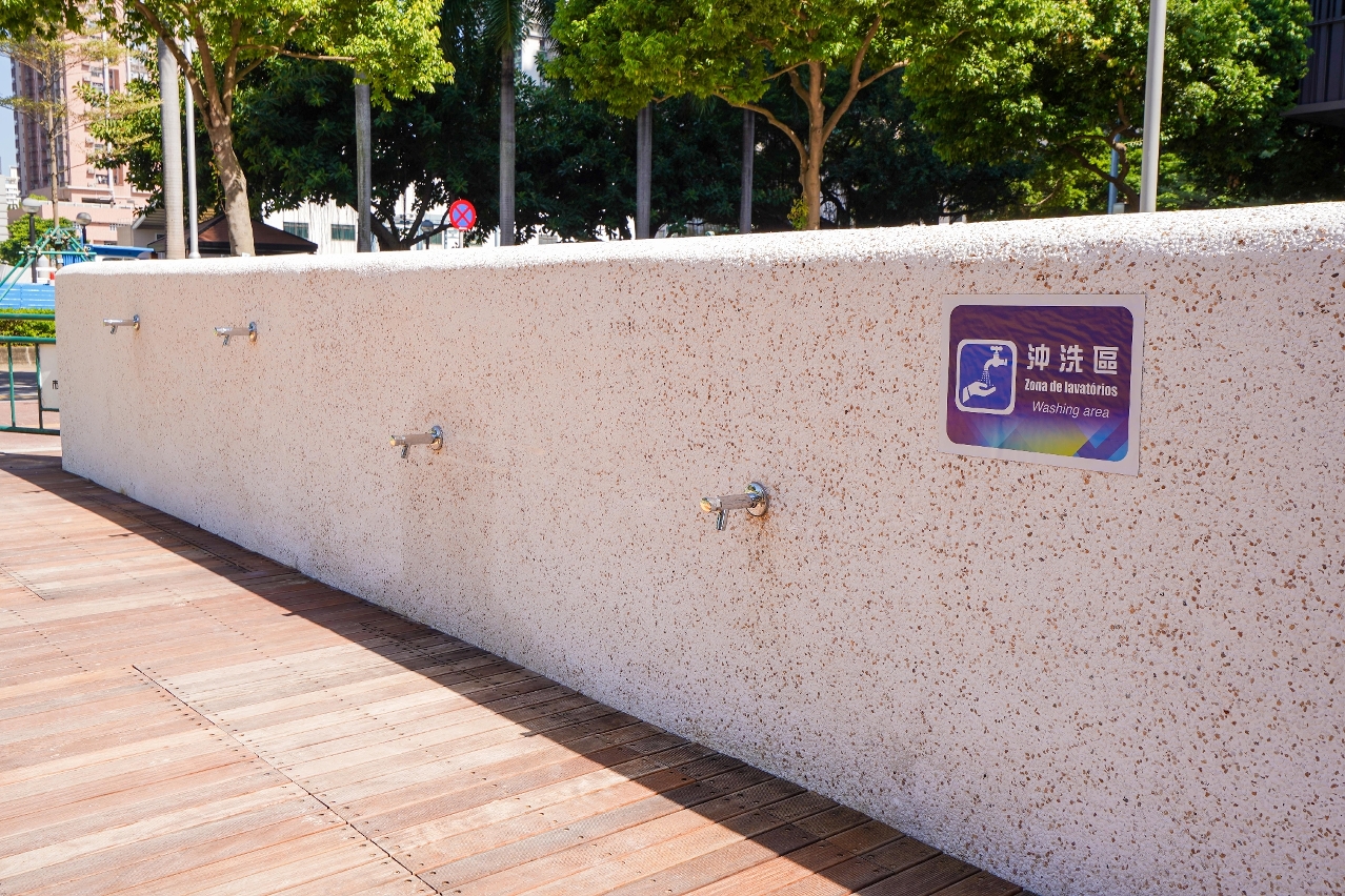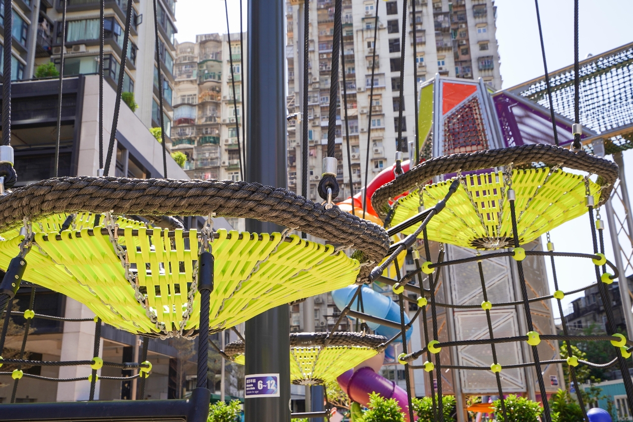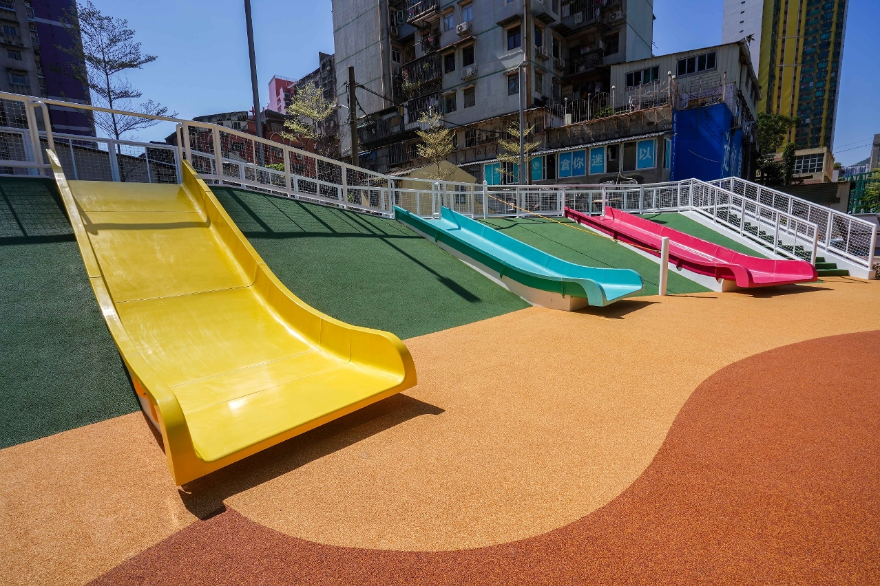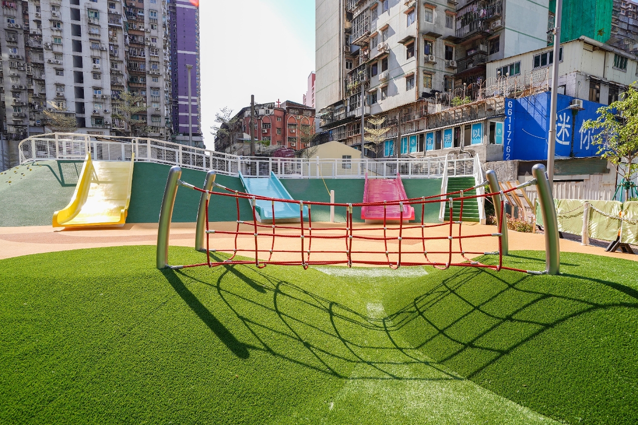 Innovative play facilities are introduced to the children’s playground, including the first outdoor sandpit in Macao Peninsula that would create an environment for mutual assistance and carefree amusement with peers, so that children can easily enjoy the fun of sand and water in the community, and show their creativity in building games with sands. To ensure the safety of young children, those under the age of five must be accompanied by their parents to enter the sandpit. Meanwhile, to control crowds at the early stage after the opening, appointment is required for entering the sandpit. Besides the daily check and cleaning before opening, the sandpit will be closed for maintenance once a month to ensure its quality. There are also a slide area, artificial grass hills and other parent-child play equipment in the playground divided into different zones by age and suitable for children aged 3 to 12 to practise physical coordination and balance. Another group of moderately challenging high-rise play facilities with climbing elements allows older children to learn how to play safely and exercise their physical fitness in the game. IAM has arranged for personnel to maintain order in the playground. Parents and children are advised to follow their instructions and pay attention to safety.