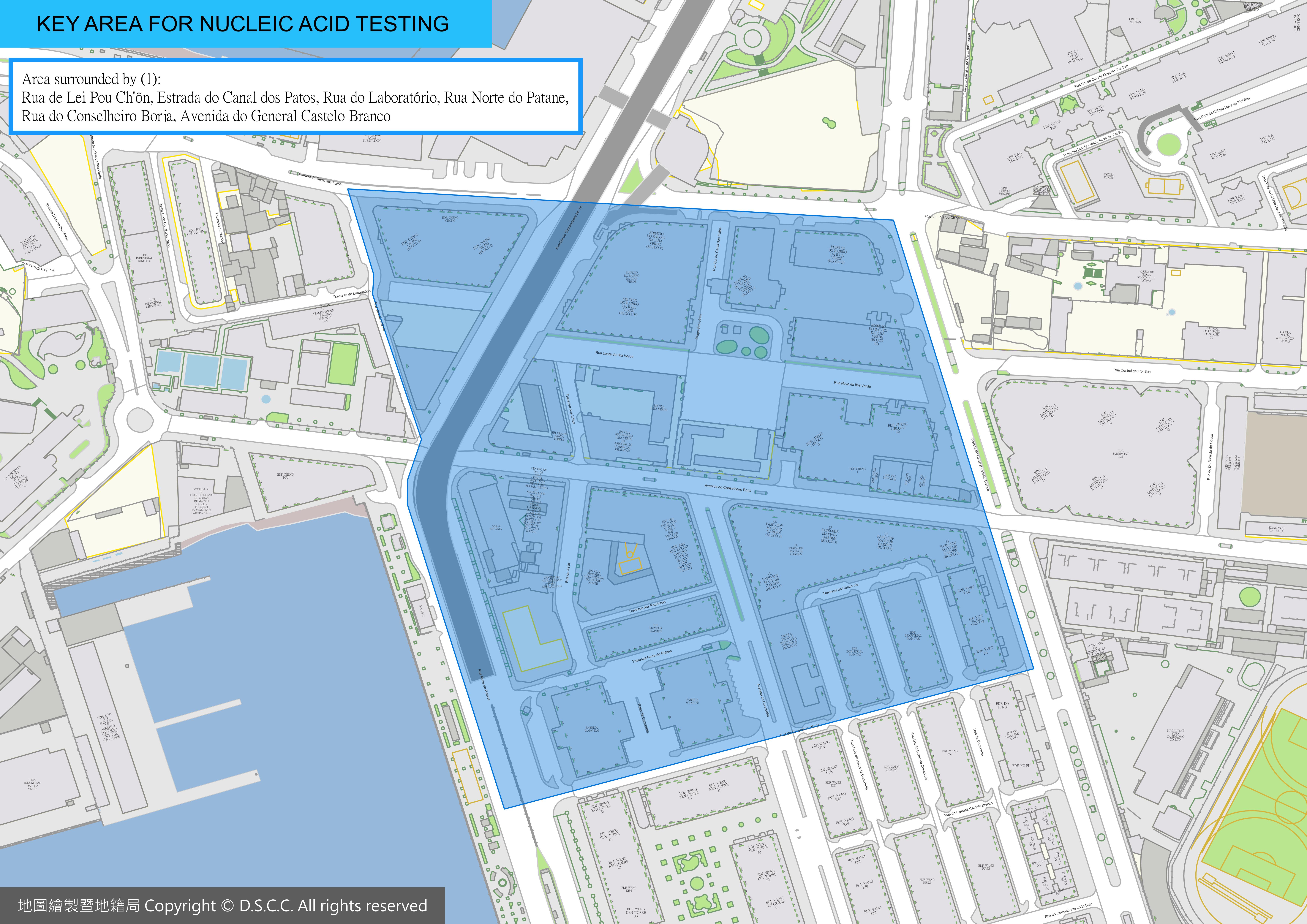 • People who live or work in the area surrounded by Rua de Lei Pou Ch'ôn, Estrada do Canal dos Patos, Rua do Laboratório, Rua Norte do Patane, Rua do Conselheiro Borja, Avenida do General Castelo Branco;