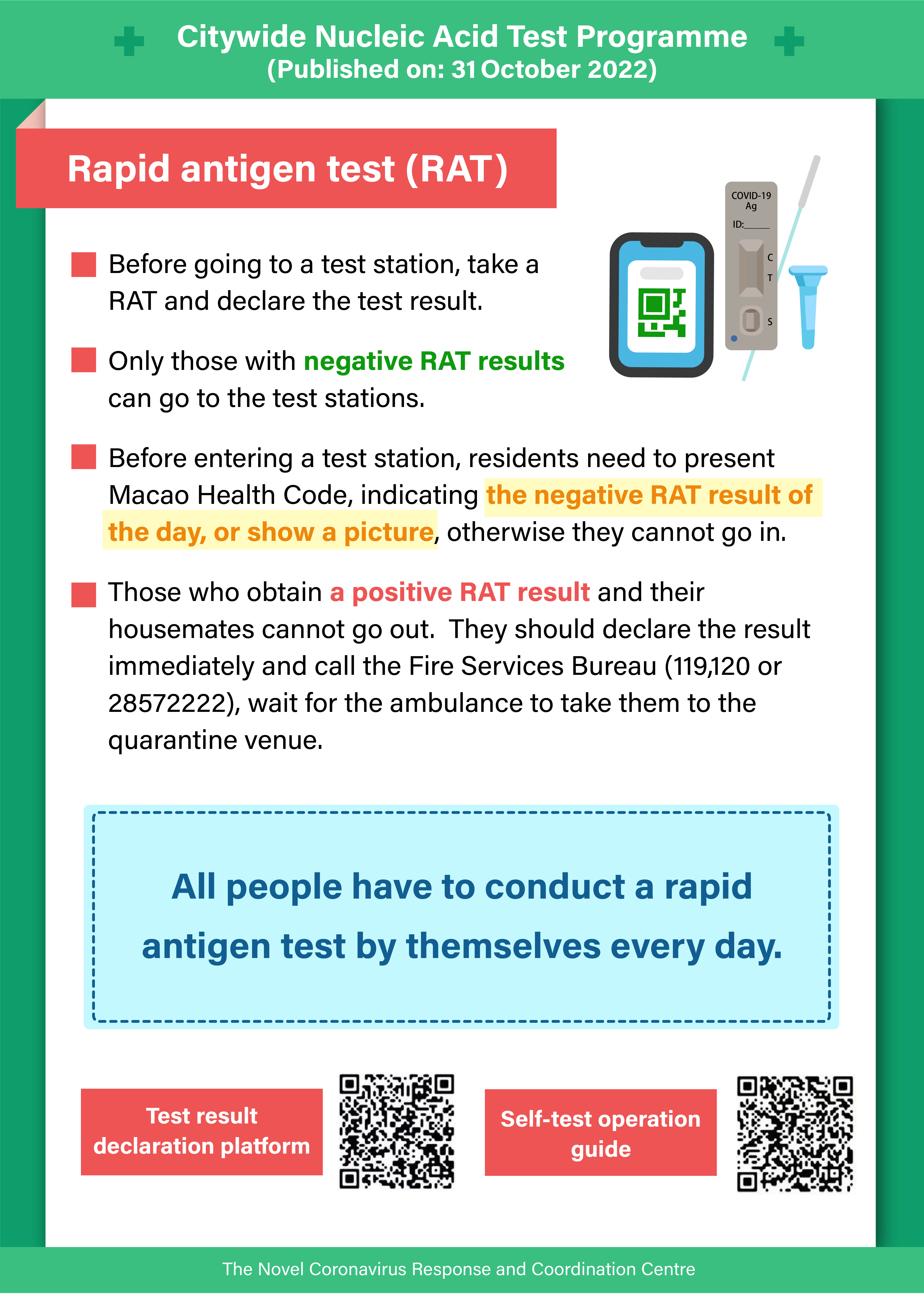 - Self-paid test booking link (paper certificate can be provided, result will be uploaded to the Macao Health Code for use in border-crossing, and will be counted in the citywide NAT scheme): https://eservice.ssm.gov.mo/rnatestbook.