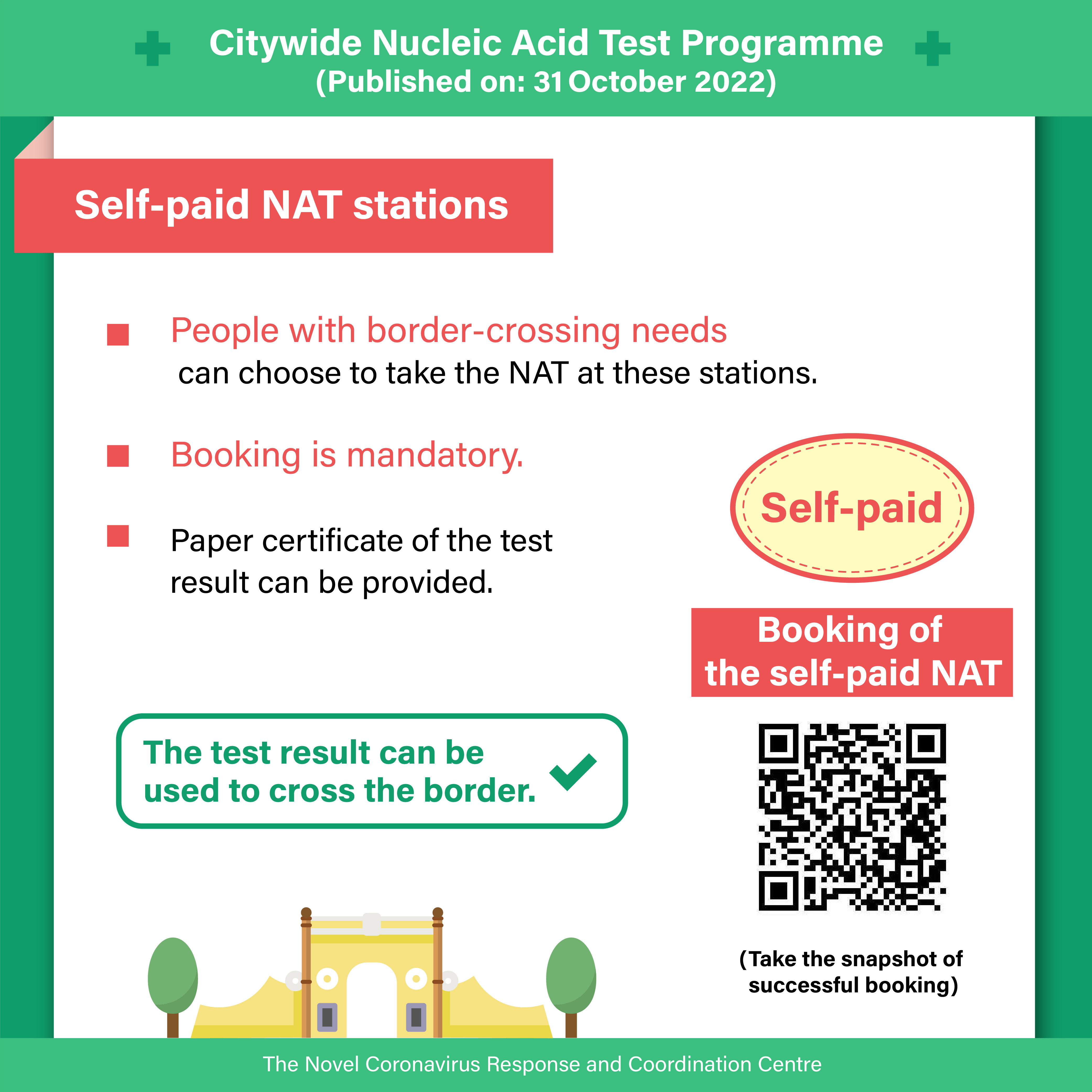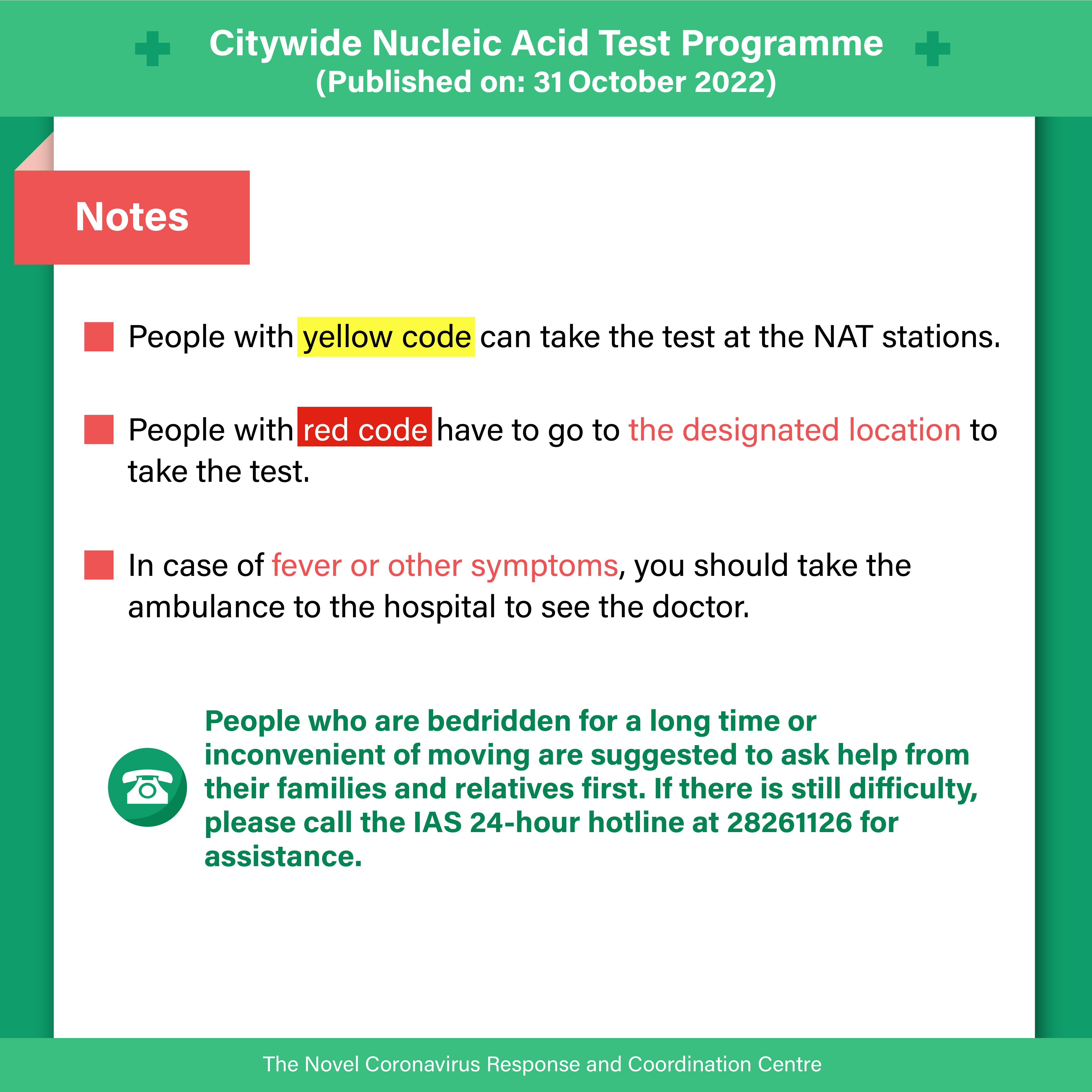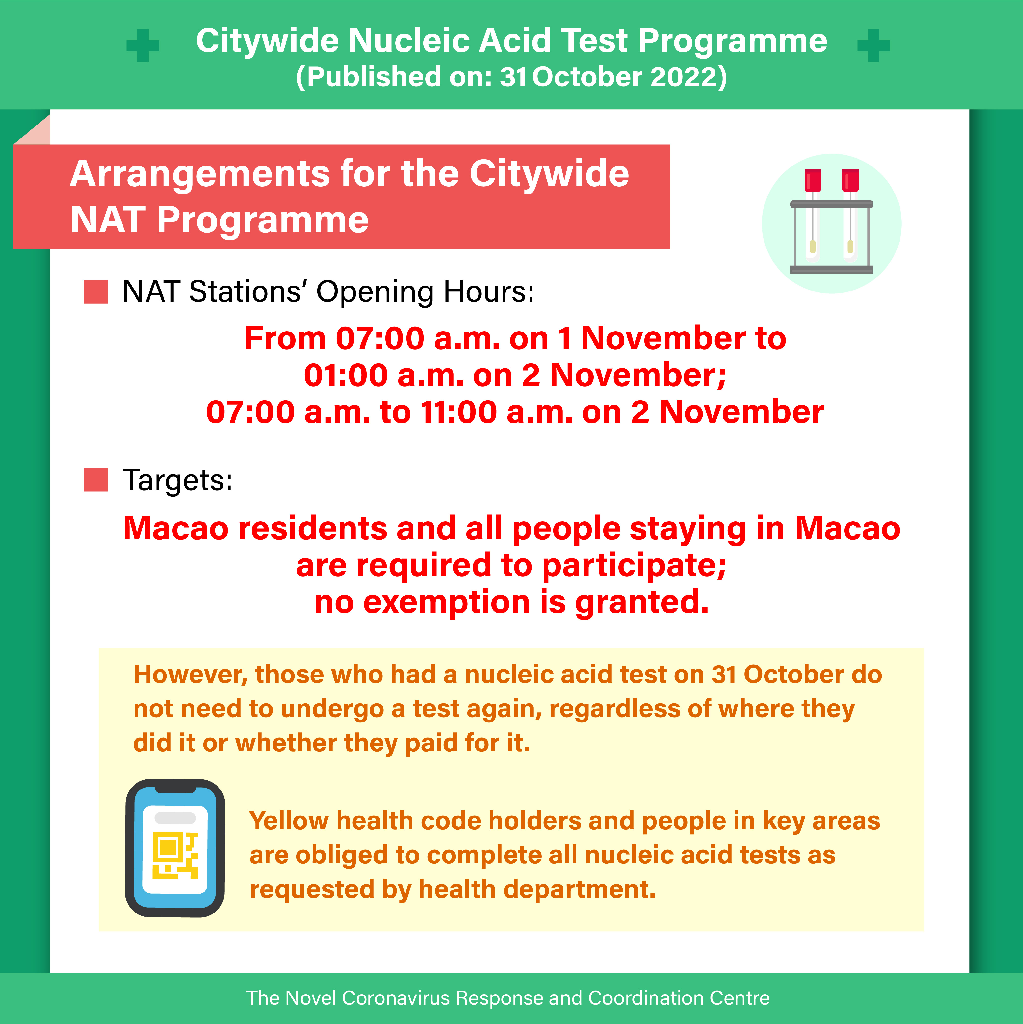 - To avoid repeat testing, all nucleic acid tests performed on 31 October - regardless of where the samples were collected or whether they were free or not - will be counted into the present citywide NAT scheme;