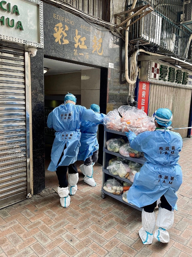 As the tropical cyclone signal no. 3 is in force in Macao now, the Subsistence Team continues to provide support and distribute living necessities in the various Red Code buildings. Extra food packs with vegetables and frozen meat or emergency food packs are distributed to the households today (1 November) as storage food, so as to satisfy the basic needs for food of the households in case food cannot be delivered at the door during the typhoon period. Meanwhile, tomorrow, the service of collection of the life supplies delivered by friends and relatives of the households in the Red Code buildings is suspended.