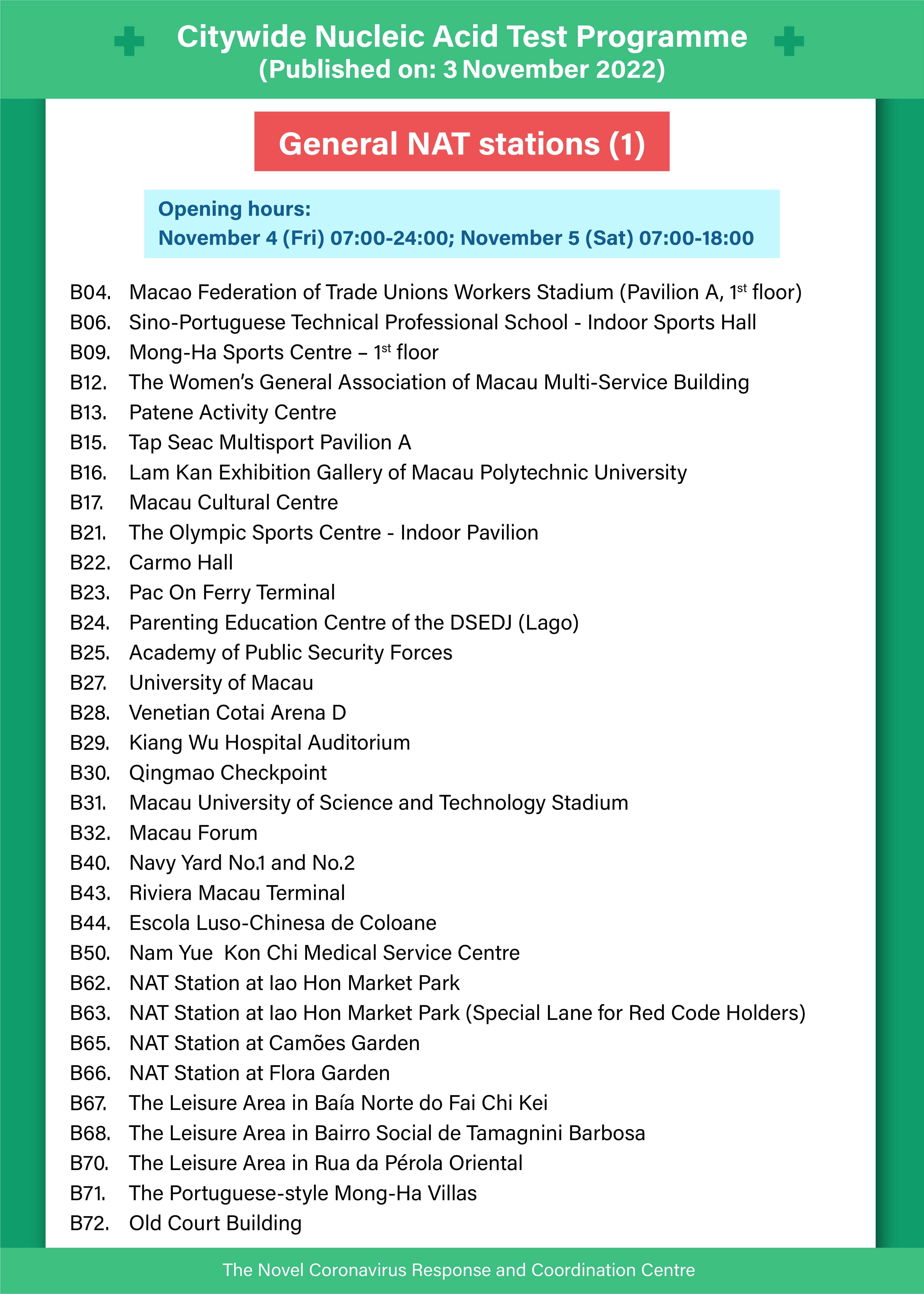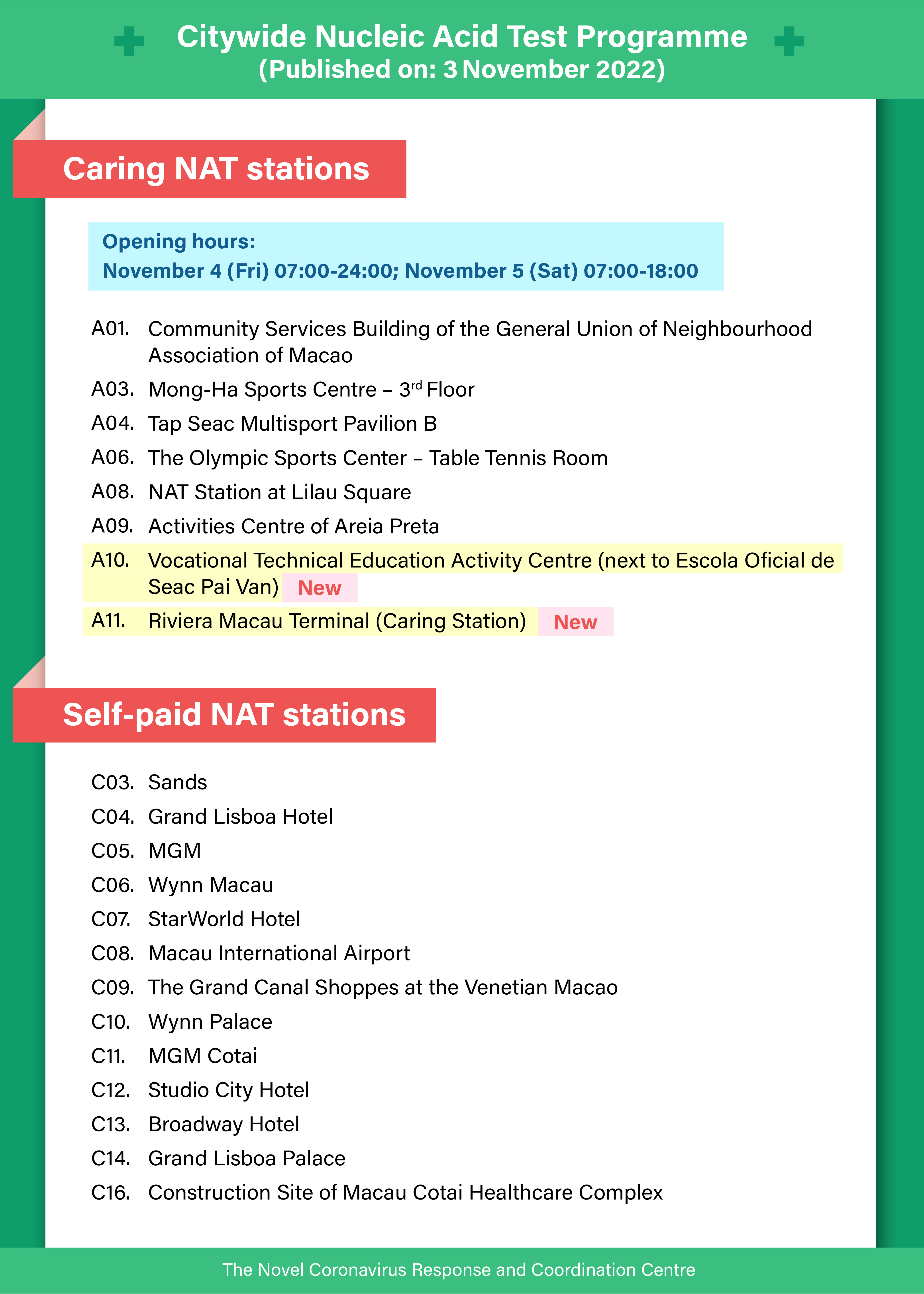 • There are caring stations (booking is not required), general stations (booking required) and self-paid stations (booking required). Members of the public may click on the link on the main page of the Nucleic Acid Test for COVID-19 Booking System or enter the “Info Map of NAT Stations” directly through this link (https://app.ssm.gov.mo/rnastation/map) in order to access the information including the address and service hours of NAT stations.