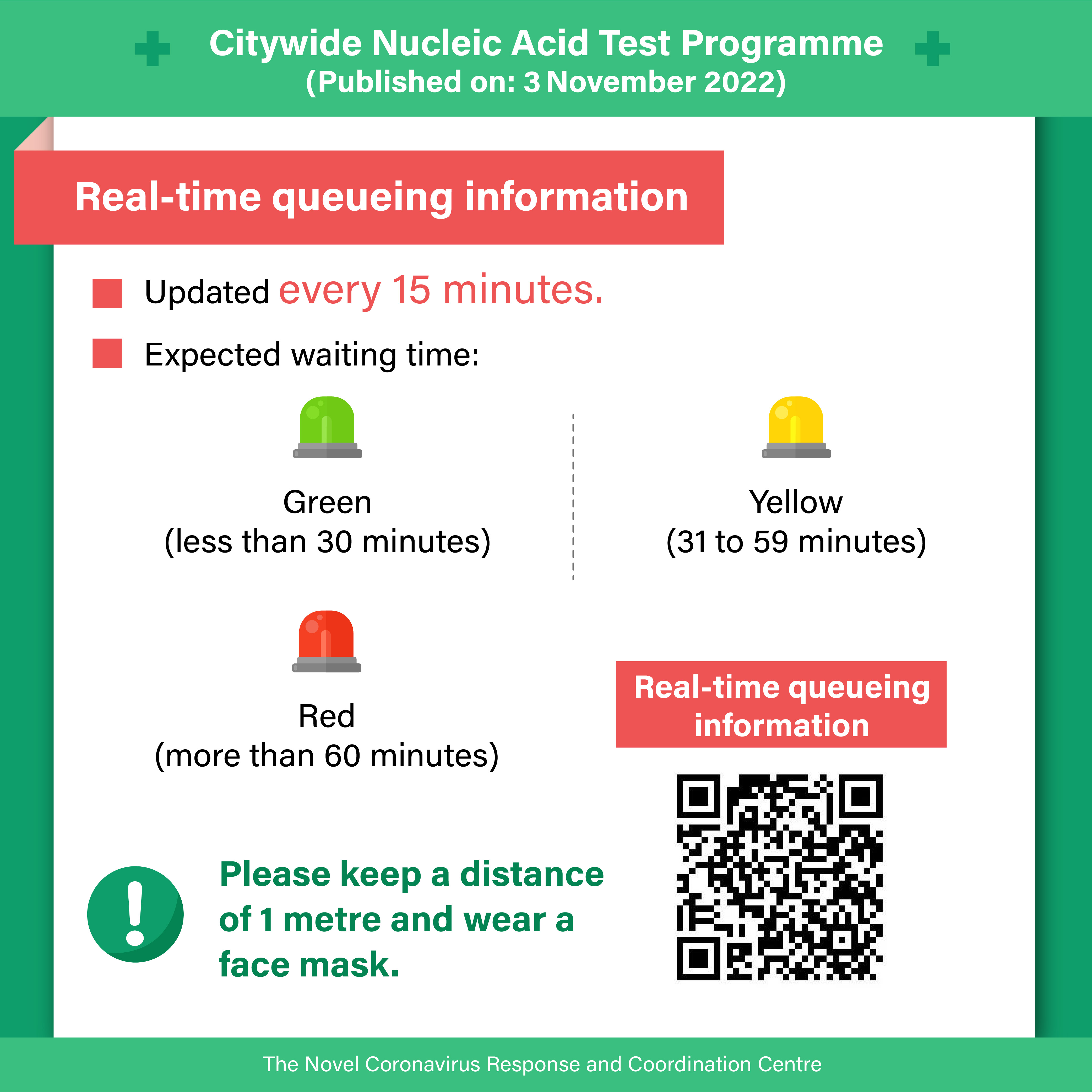 The booking system for citywide NAT operates on the basis of sampling stations to enable accurate capacity management. Real-time waiting information (namely, the number of sampling booths, number of people waiting, expected waiting time, and number of bookings) at different stations will be disseminated 4 times every hour by diversified means. The expected waiting time is shown in three colours:
