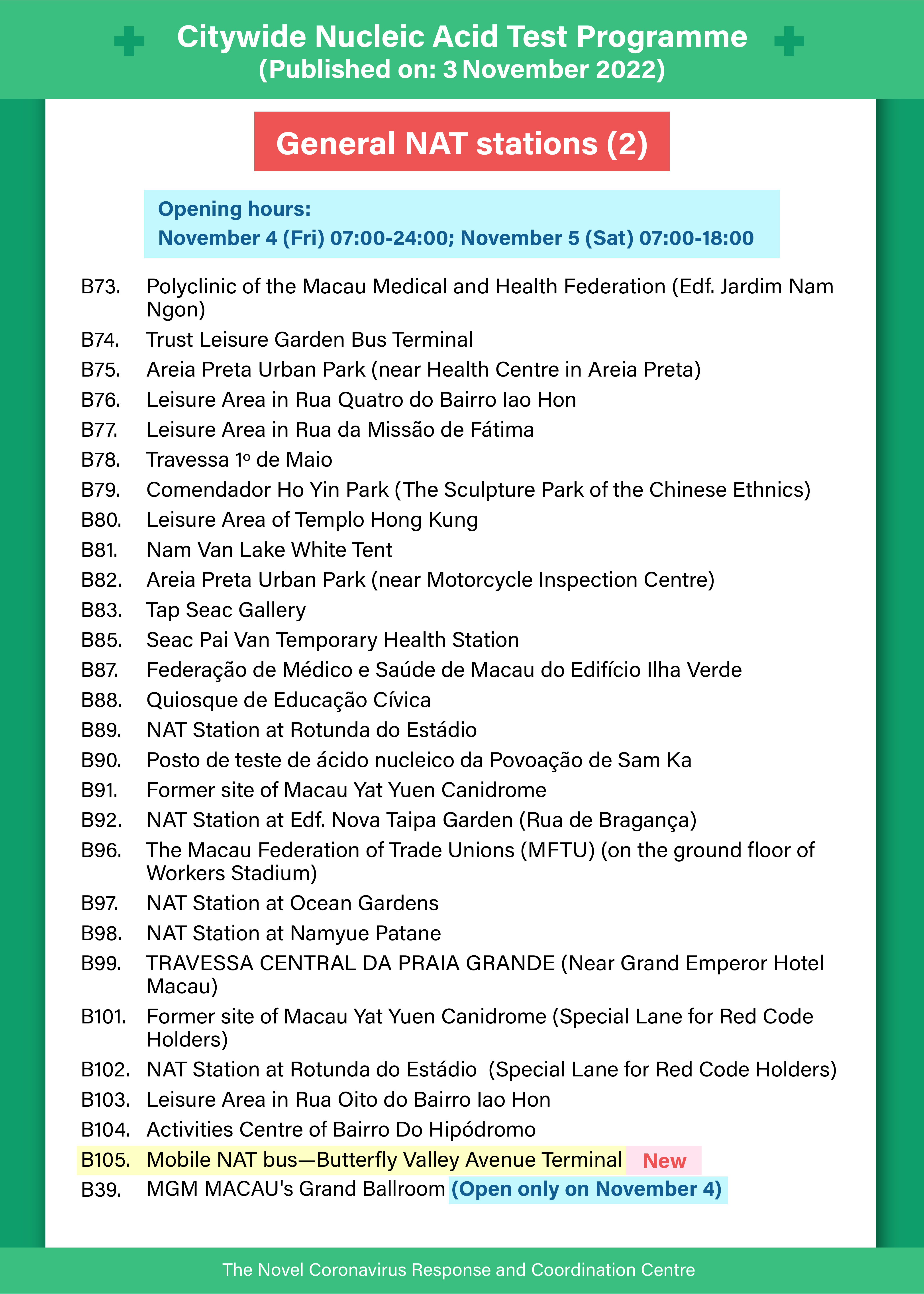 • The appointment system will be put into operation from 21:00 on 3 November. Free test booking link (result cannot be used for border-crossing purposes): https://eservice.ssm.gov.mo/allpeoplernatestbook.