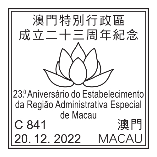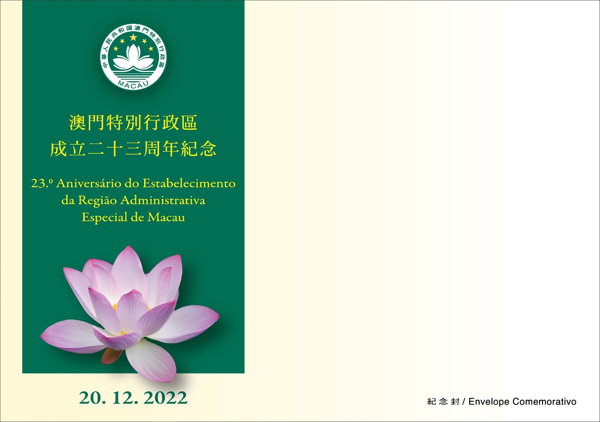 To celebrate the 23rd Anniversary of the Establishment of the Macao Special Administrative Region, Macao Post and Telecommunications Bureau announces that a Temporary Post Counter will be set up at the Philatelic Shop of General Post Office from 09:00 to 14:00 on 20th December 2022, to provide the commemorative postmark cancellation service for the “23rd Anniversary of the Establishment of the Macao Special Administrative Region”. A commemorative envelope priced at MOP3.00 will be issued.