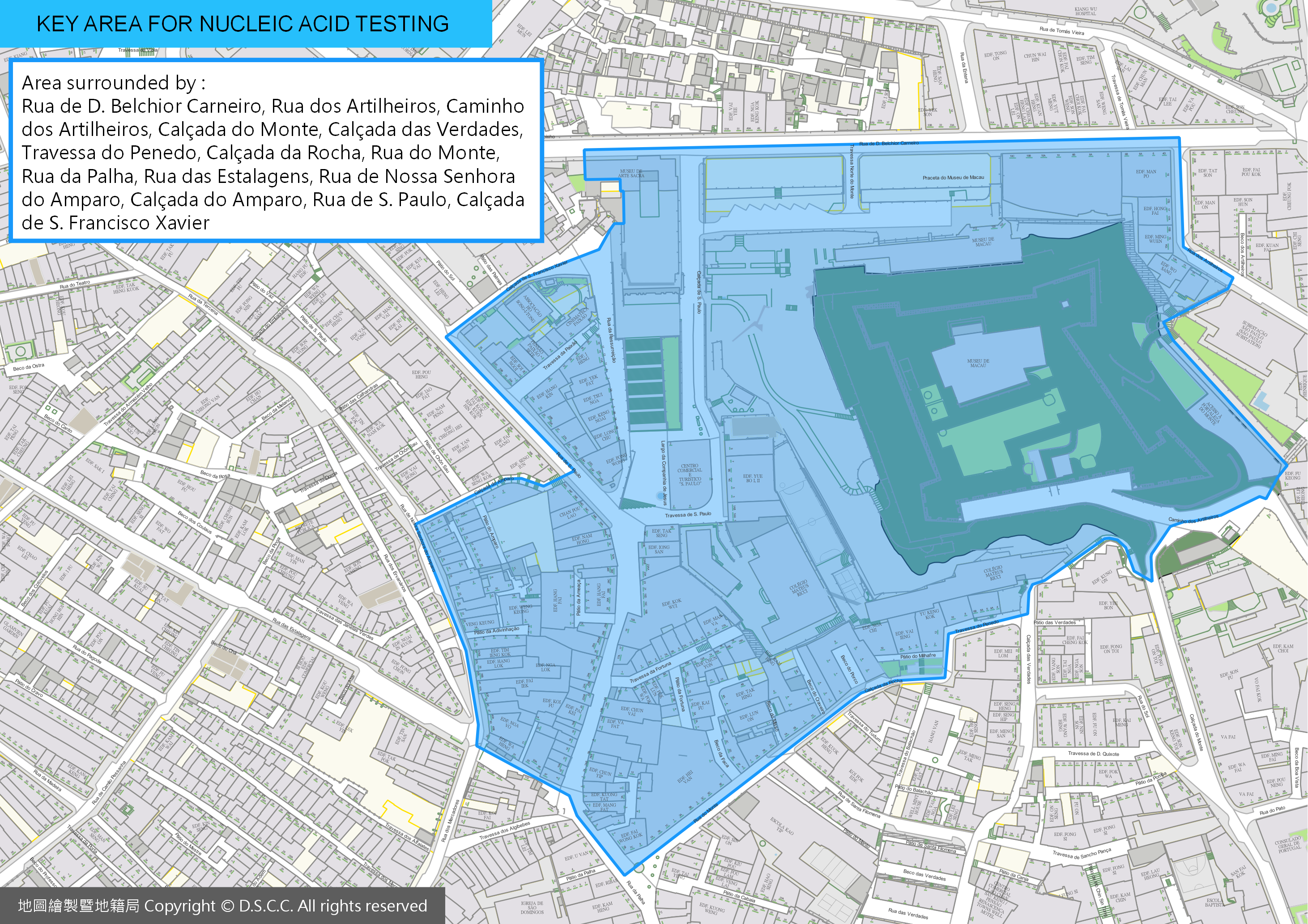 - People who have resided, worked or stayed for more than half an hour on 18 November in the area surrounded by Rua de D. Belchior Carneiro, Rua dos Artilheiros, Caminho dos Artilheiros, Calçada do Monte, Calçada das Verdades, Travessa do Penedo, Calçada da Rocha, Rua do Monte, Rua da Palha, Rua das Estalagens, Rua de Nossa Senhora do Amparo, Calçada do Amparo, Rua de S. Paulo, Calçada de S. Francisco Xavier;