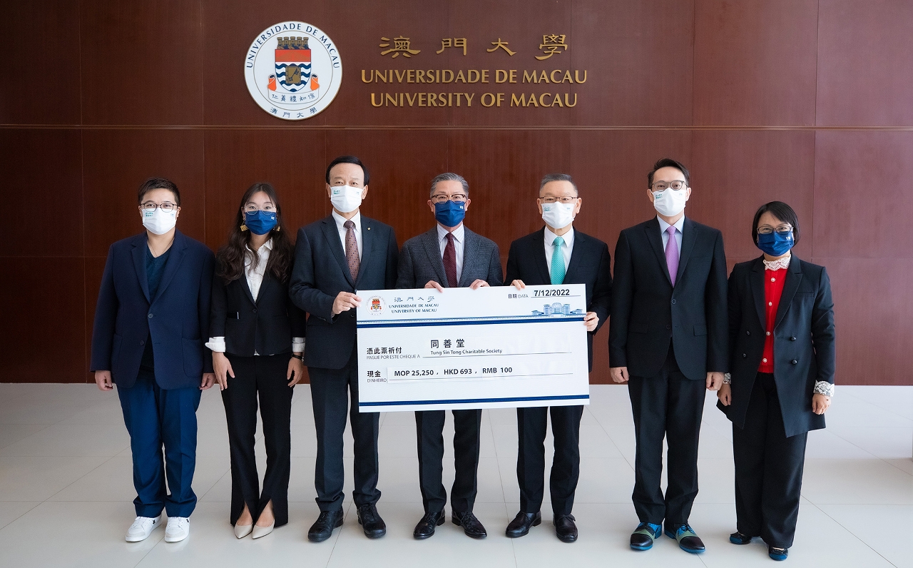 To promote philanthropy and foster a culture of caring, the University of Macau (UM) and Tung Sin Tong recently co-organised a charity sale for tailor-made herbal tea bags from Tung Sin Tong’s Chinese medicine pharmacy, as well as an annual fundraiser, on the university campus. A cheque presentation ceremony was recently held and all the donations will be used by Tung Sin Tong for charitable purposes such as medical services and free education.