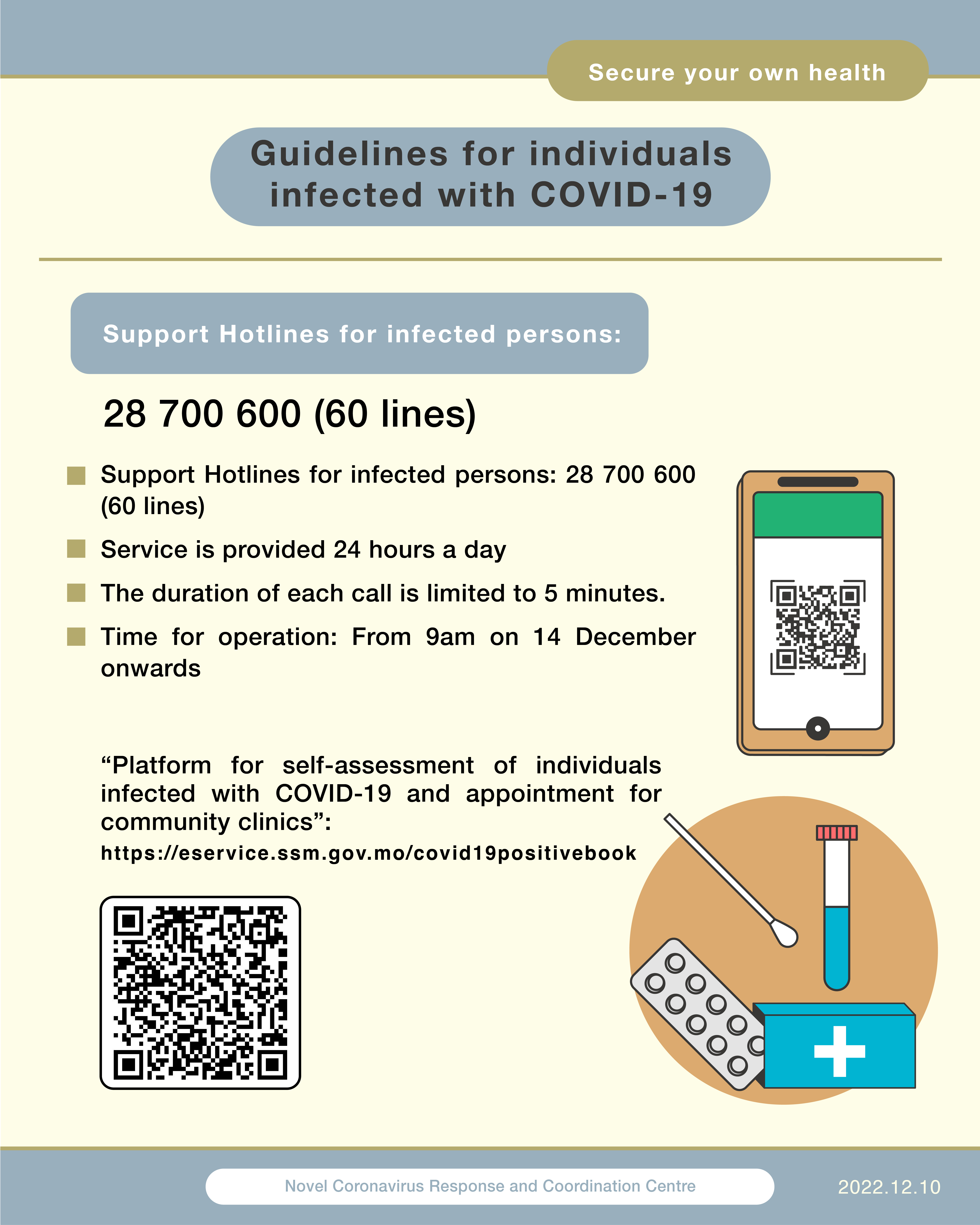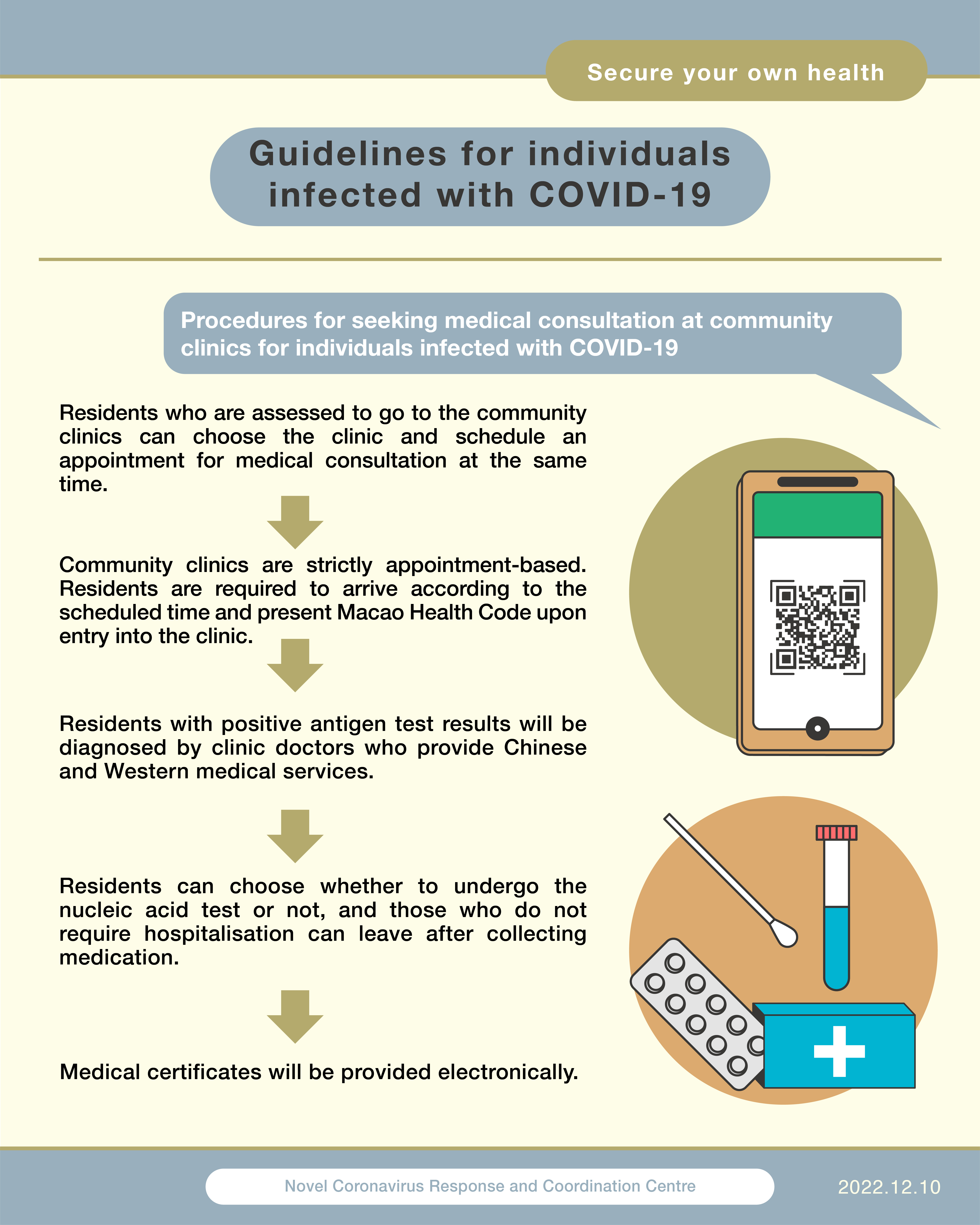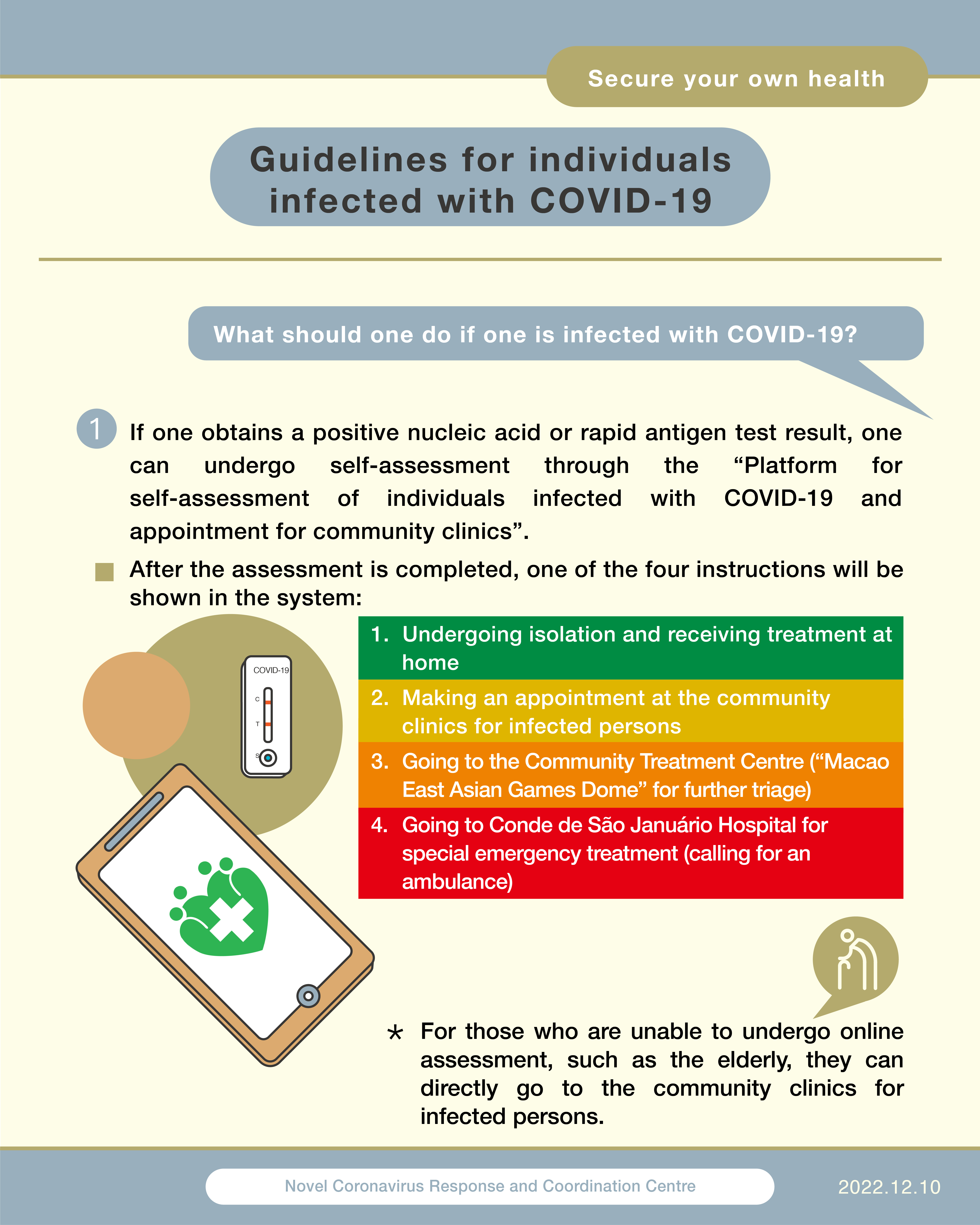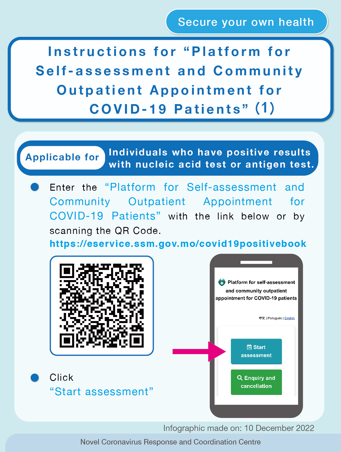 Residents who have a positive NAT or RAT result must first assess their condition by themselves via the ‘Platform for Self-assessment and Community Outpatient Appointment for COVID-19 Patients’ (https://eservice.ssm.gov.mo/covid19positivebook) (to be opened on 14 December) (see the attachment ‘Infographic Set 1’ for the specific procedures). After assessment they can, based on the instructions given, undergo home quarantine, make an appointment with ‘community clinics for individuals infected with COVID-19’ (community clinics) or go to the Community Treatment Centre (Hall A of Macao East Asian Games Dome) (see the attachment ‘Infographic Set 2’ for details). The emergency number 999 should be called immediately for assistance if a patient is in a critical condition.