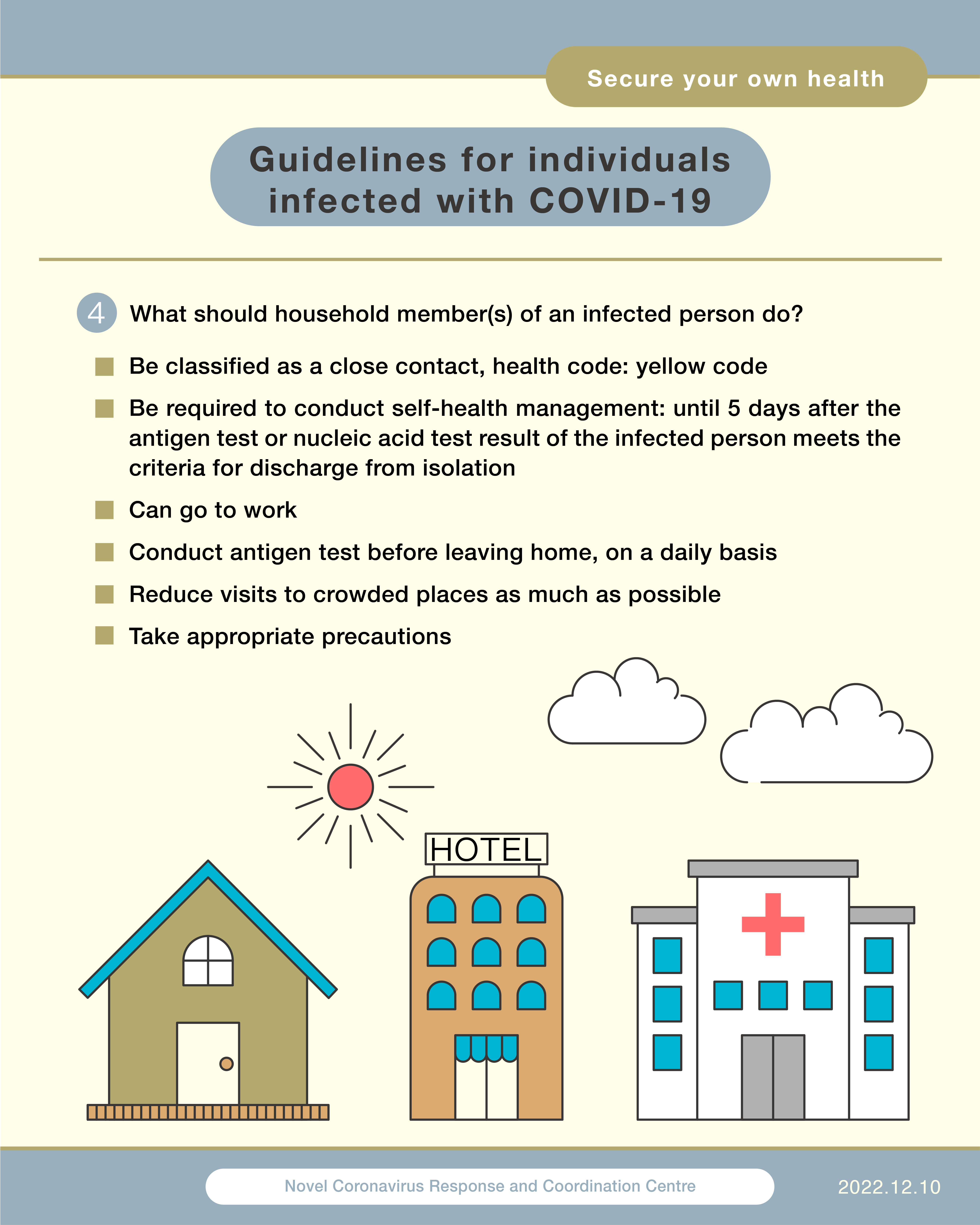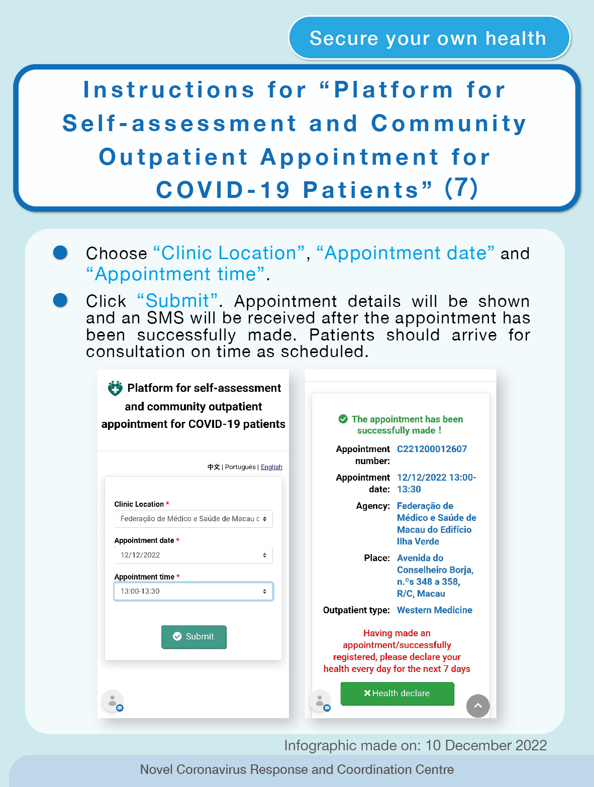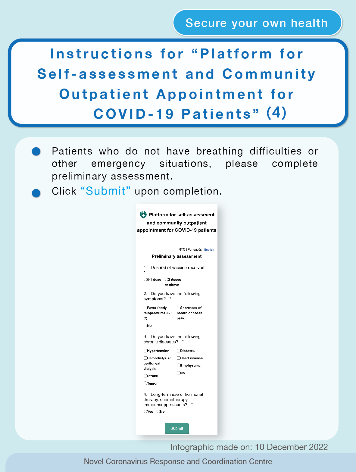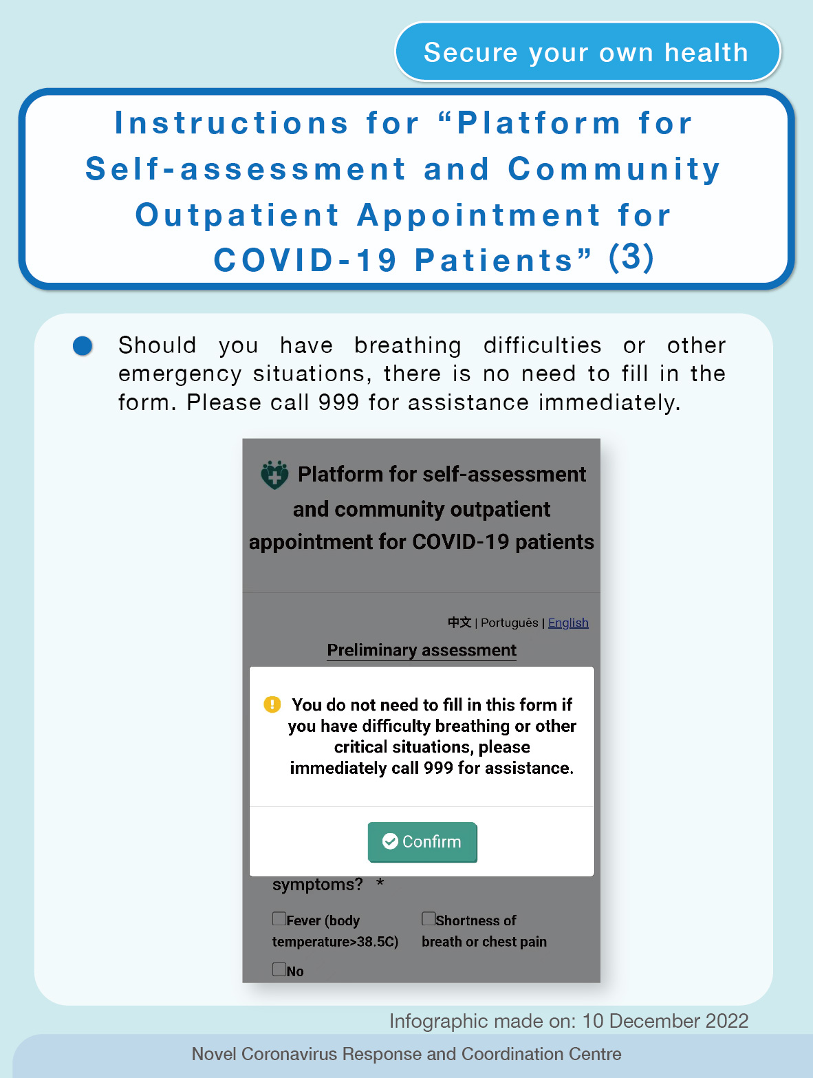 Residents who have a positive NAT or RAT result must first assess their condition by themselves via the ‘Platform for Self-assessment and Community Outpatient Appointment for COVID-19 Patients’ (https://eservice.ssm.gov.mo/covid19positivebook) (to be opened on 14 December) (see the attachment ‘Infographic Set 1’ for the specific procedures). After assessment they can, based on the instructions given, undergo home quarantine, make an appointment with ‘community clinics for individuals infected with COVID-19’ (community clinics) or go to the Community Treatment Centre (Hall A of Macao East Asian Games Dome) (see the attachment ‘Infographic Set 2’ for details). The emergency number 999 should be called immediately for assistance if a patient is in a critical condition.