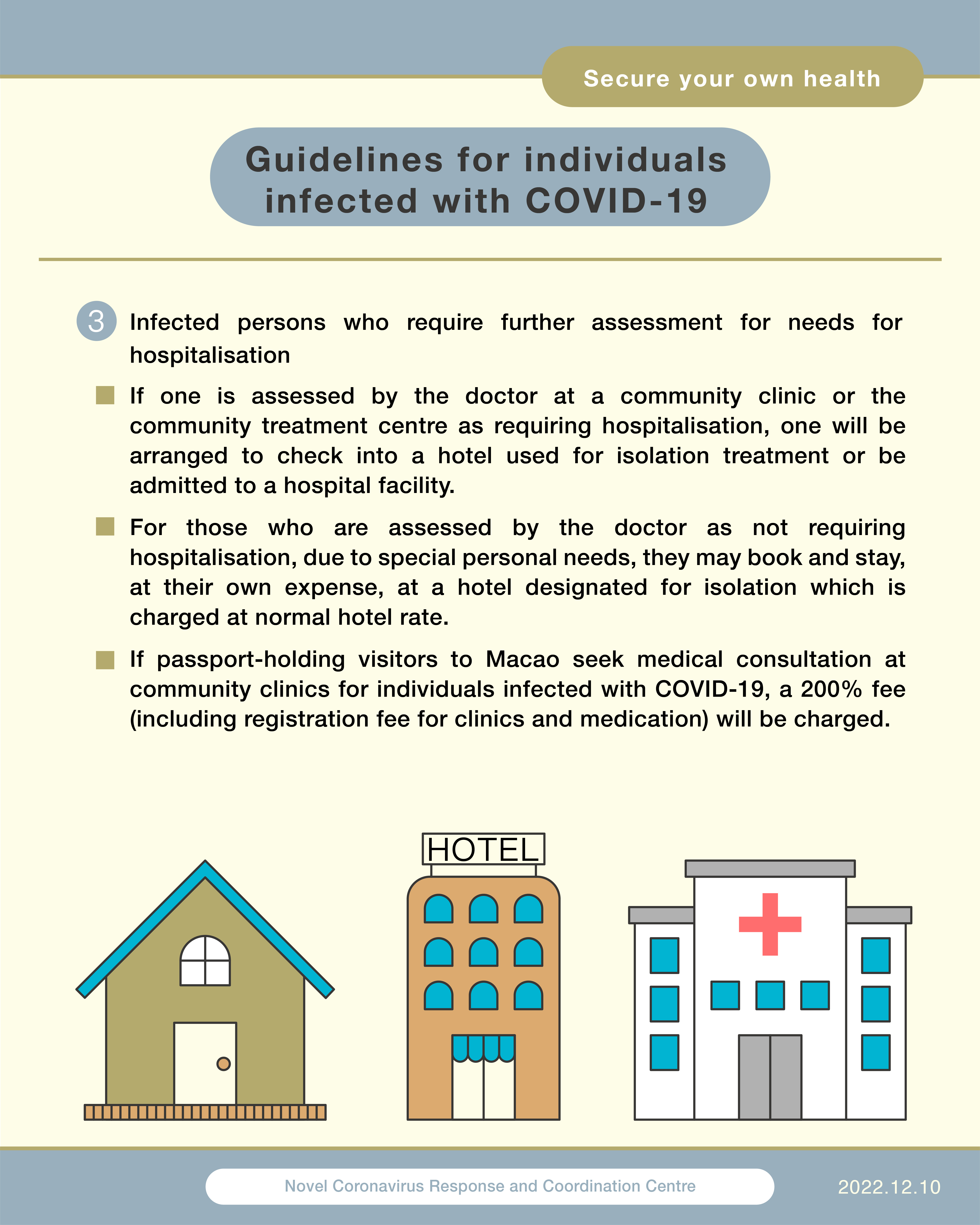 Infected individuals requiring medical care will be evaluated by doctors at a community clinic or the Community Treatment Centre. Those who are assessed as requiring hospitalisation will be arranged to stay in a quarantine treatment hotel or hospital at a charge on a par with those for hospital inpatient services. Patients who are assessed to not require hospitalisation can leave the clinic or the centre after collecting their medication, and those with personal special needs can book a designated quarantine treatment hotel on their own and pay the expenses as per the normal hotel fees. In addition, consultation fees for tourists visiting Macao with a visa will be charged at 200% (including the registration and medication fees) when seeking medical care at a community clinic for COVID-19 patients.