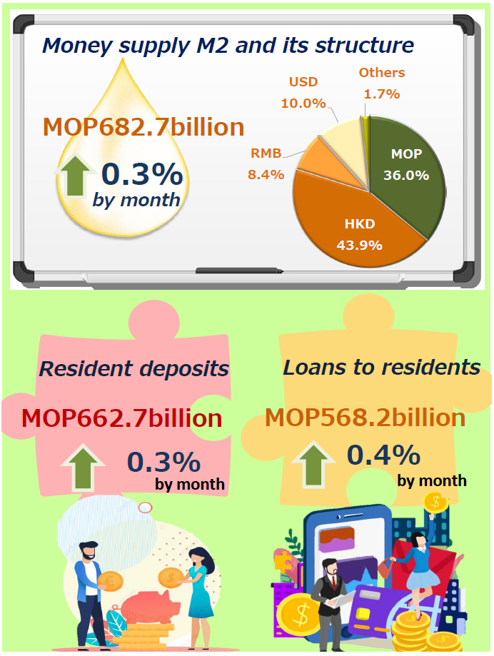 Currency in circulation and demand deposits dropped 0.5% and 3.1% respectively. M1 thus decreased 2.4% from one month earlier.  On the other hand, quasi-monetary liabilities increased 0.5%.  The sum of these two items, i.e. M2, grew 0.3% to MOP682.7 billion.  On an annual basis, M1 and M2 fell 9.3% and 1.2% respectively.  The shares of pataca (MOP), Hong Kong dollar (HKD), renminbi (RMB) and United States dollar (USD) in M2 were 36.0%, 43.9%, 8.4% and 10.0% respectively.
