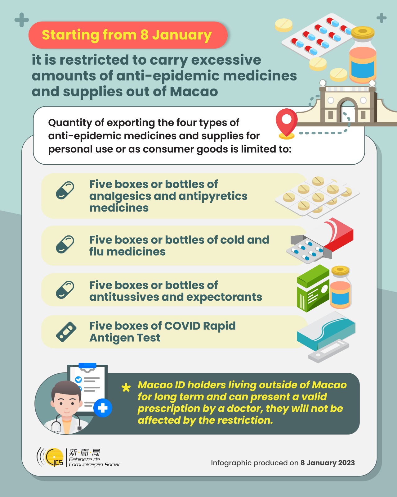 [Infographic] Starting from 8 January, it is restricted to carry excessive amounts of anti-epidemic medicines and supplies out of Macao