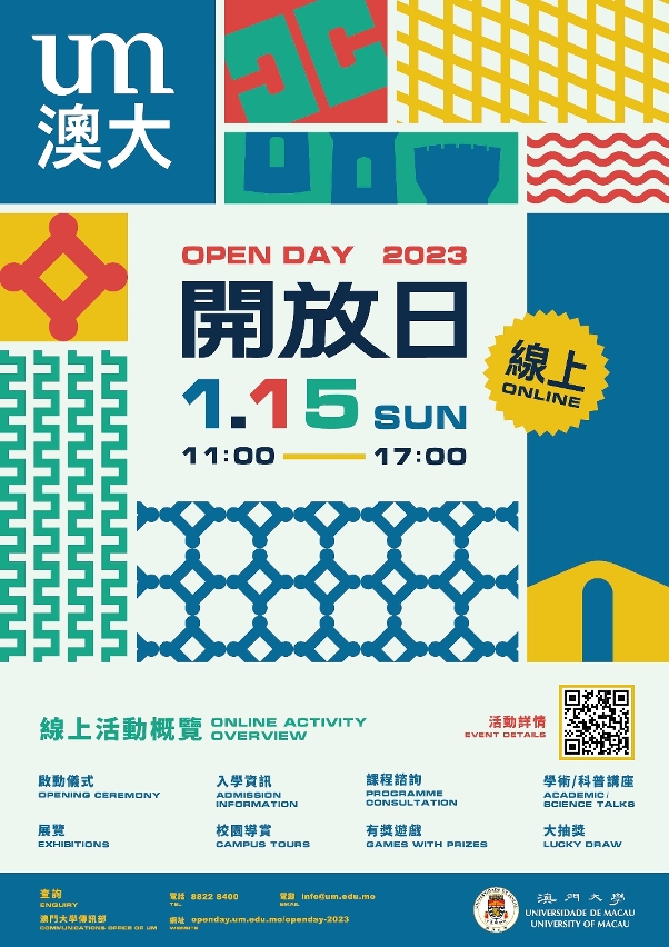 The University of Macau (UM) will hold the UM Open Day 2023 online on Sunday 15 January. The event will provide an opportunity for students, their parents, and friends from Macao, other parts of China, and overseas to tour the UM campus anytime, anywhere, to learn about the latest admission information, academic characteristics, and research results of the university. Those who are interested can join the event by visiting the UM Open Day website from 11:00am on the day of the event.