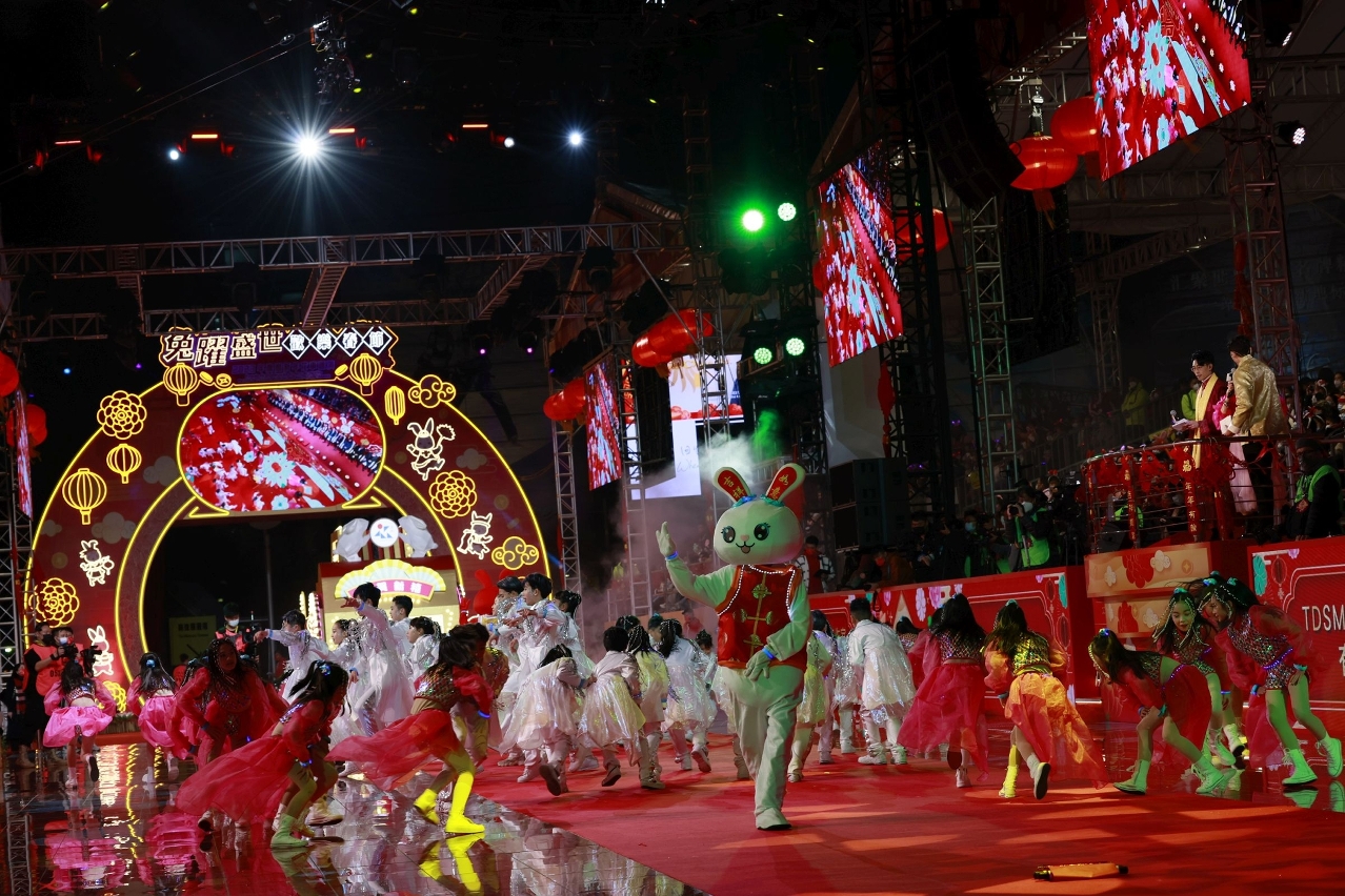 The Parade is themed around “the Rabbit leaping for the joyful Spring Festival in times of prosperity” this year. Hong Kong pop band Supper Moment and Mainland singer group AKB48 Team SH lifted the curtains upon the opening ceremony with their dazzling performances on the 3rd night of Lunar New Year. A total of 18 splendid floats debuted successively with over 1,000 performers at the nearly-4,300-foot-wide LED stage. The floats and performance groups marched along the parade route, winning cheers of residents and visitors.