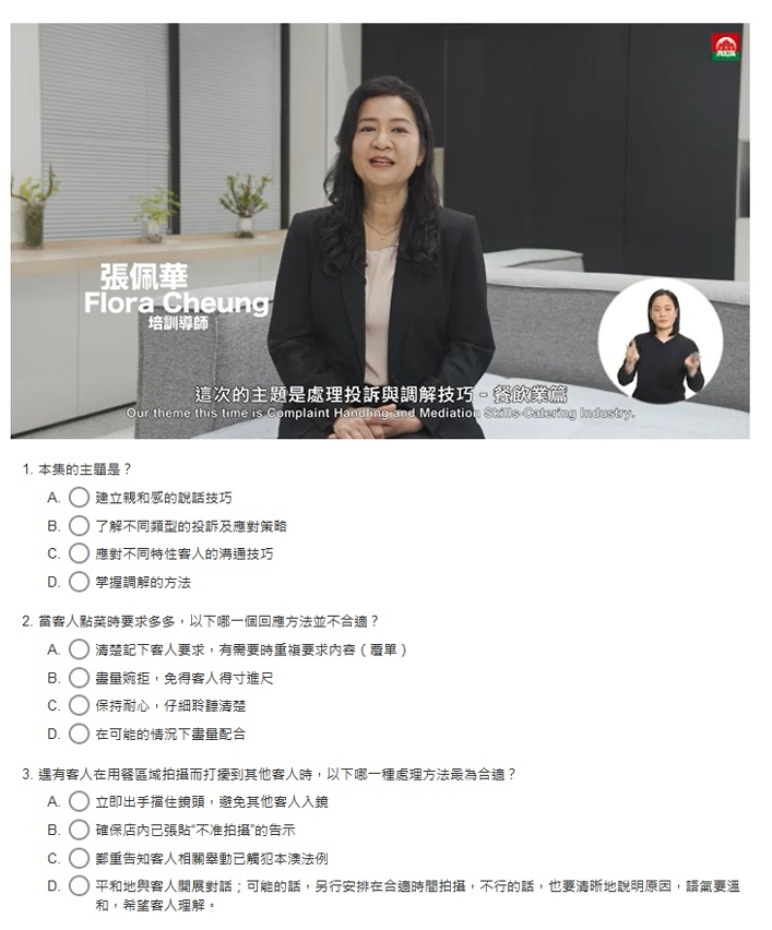 The series of six learning videos is themed as “Complaint Handling and Mediation Skills – Catering Industry”, comprising lectures and analysis of different case scenarios. With over 10 years of training experience, instructor Flora Cheung will elaborate on six topics as follows: Building Rapport with Conversations, Techniques to channel complainants' complaints or emotions, Common types of complaints in catering industry, Methods of dealing with different types of customer complaints, Mediation Applications, Concepts and Models as well as Mediation Interview Skills. Catering professionals are offered opportunities to equip themselves through studying the case scenarios and working on the after-class assignments. They can learn how to apply coping and mediation skills systemically to handle complaints and resolve disputes properly should any of these arise.
