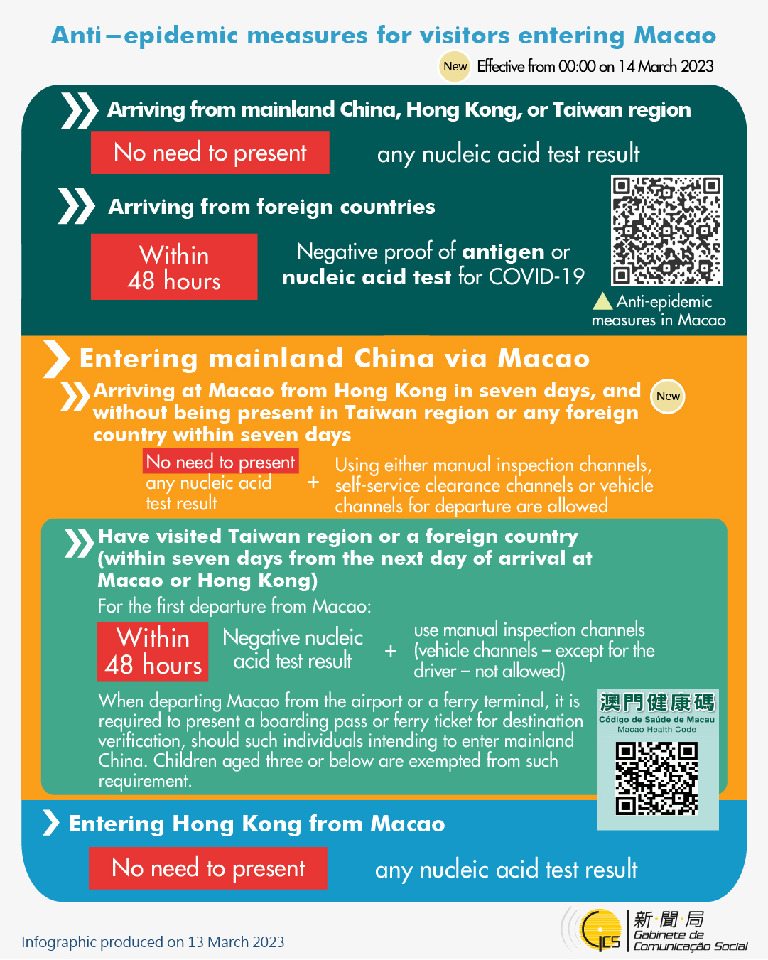[infographic] Anti-epidemic measures for visitors entering Macao (13 March 2023 )