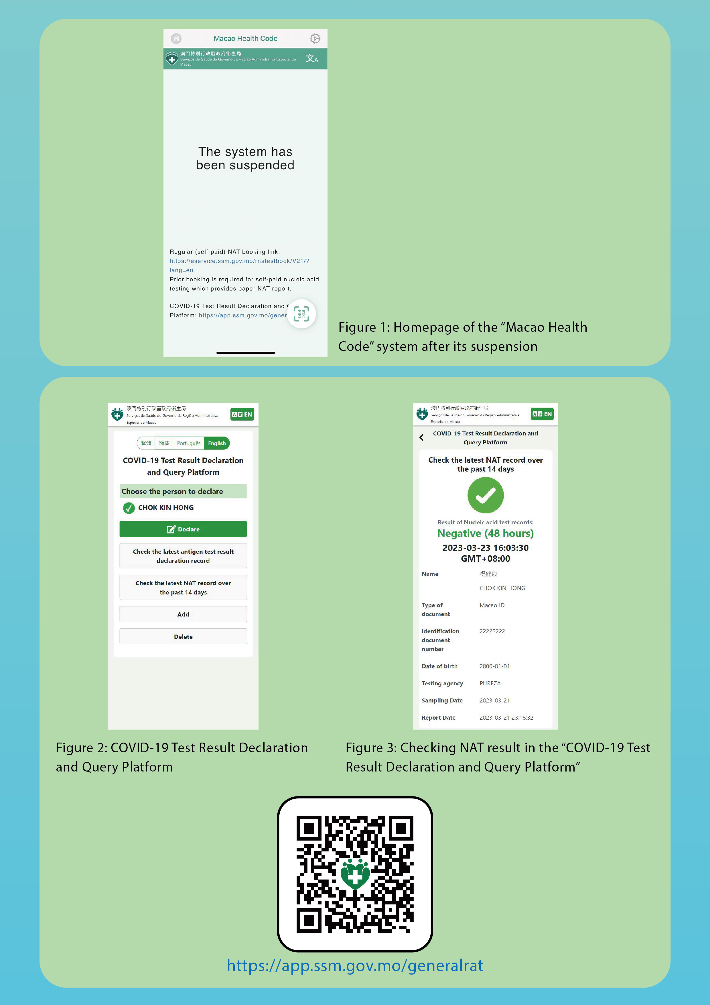 The Novel Coronavirus Response and Coordination Centre indicates that the “Macao Health Code” system will cease operation from 27 March, as the requirement for people with Hong Kong travel/residence history to present a Macao Health Code when leaving Macao for Mainland China has been lifted since 14 March. Despite its discontinuation, the “Macao Health Code” system will remain accessible with the wording “System suspended” appear on its homepage, and provide the booking link of regular (self-paid) nucleic acid test and the link to the “COVID-19 Test Result Declaration and Query Platform” for user convenience (see Figure 1).