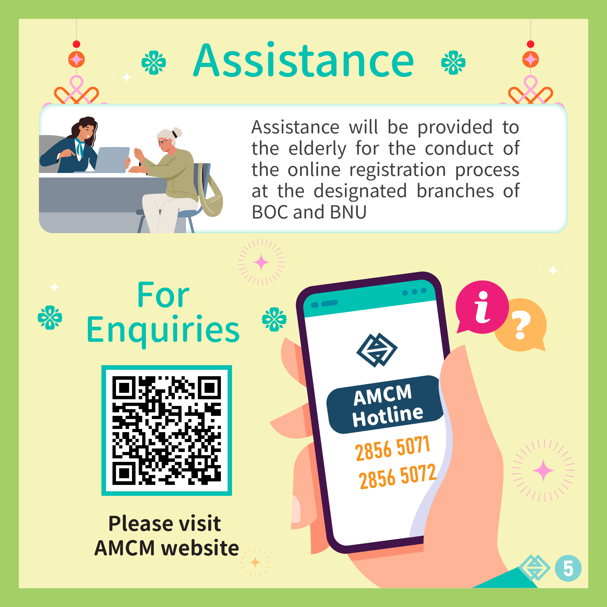 At designated branches of BOC and BNU, assistance will be provided to the elderly for the conduct of the online registration process. For enquiries, please call our hotline: 2856 5071 / 2856 5072 during business hours, or browse our website ( https://registration.amcm.gov.mo/banknotes/terms_pt.html ).