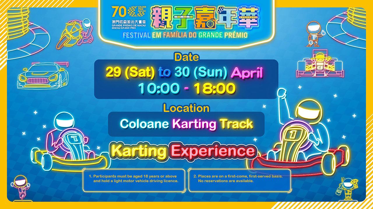 The Macau Grand Prix, an annual international major sporting event of the city, will be held on 11-12 and 16-19 November 2023. This year also marks the 70th edition of the Grand Prix. In order to allow residents and tourists to enjoy the thrilling atmosphere of the Macau Grand Prix in advance, as well as to deepen their understanding of the event, the Macau Grand Prix Organizing Committee will host the 70th Macau Grand Prix - Family Carnival at the Coloane Karting Track from 10 am to 6 pm on 29-30 April, which kicks off the festive activities for the Grand Prix this year.
