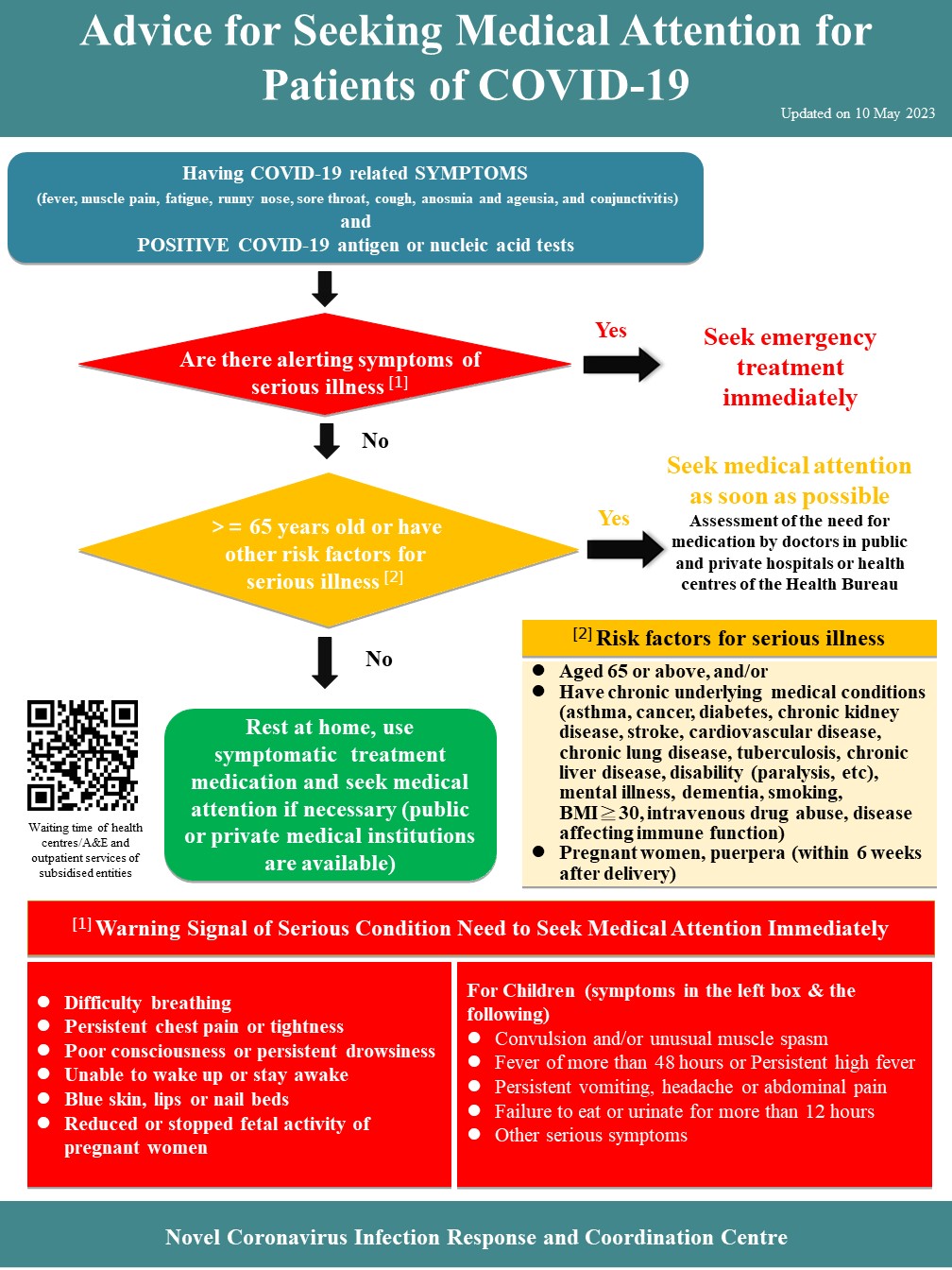 According to the Advice, people who have COVID-19 related symptoms and are positive for COVID-19 by antigen or nucleic acid test can conduct self-assessment based on their symptoms, age, whether they are pregnant, and whether they have chronic underlying diseases. Pregnant women, individuals aged 65 or above, and individuals with chronic underlying diseases are advised to go to a health center, or a public or private hospital, for medical evaluation and necessary medication, while otherwise healthy adults, teenagers and children can take symptomatic drugs by themselves, or visit any medical institution as appropriate.