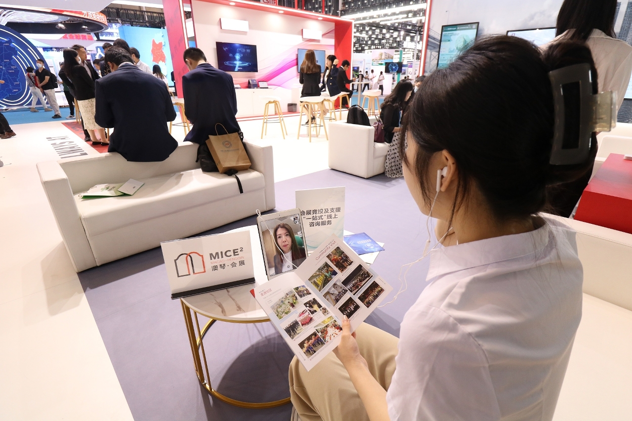 The “Macao Pavilion” also features multimedia equipment to showcase Macao’s technology and innovation environment, as well as video consultation services, providing information related to the Investor’s “One-stop” Service and the “One-stop” Service for MICE Bidding and Support provided by the Macao Trade and Investment Promotion Institute (IPIM). At the same venue, it also outlines the development profile and preferential policies of the four key industries in the Guangdong-Macao In-Depth Co-operation Zone in Hengqin, bringing into highlight the “1+1>2” synergistic effect of Macao and Hengqin.