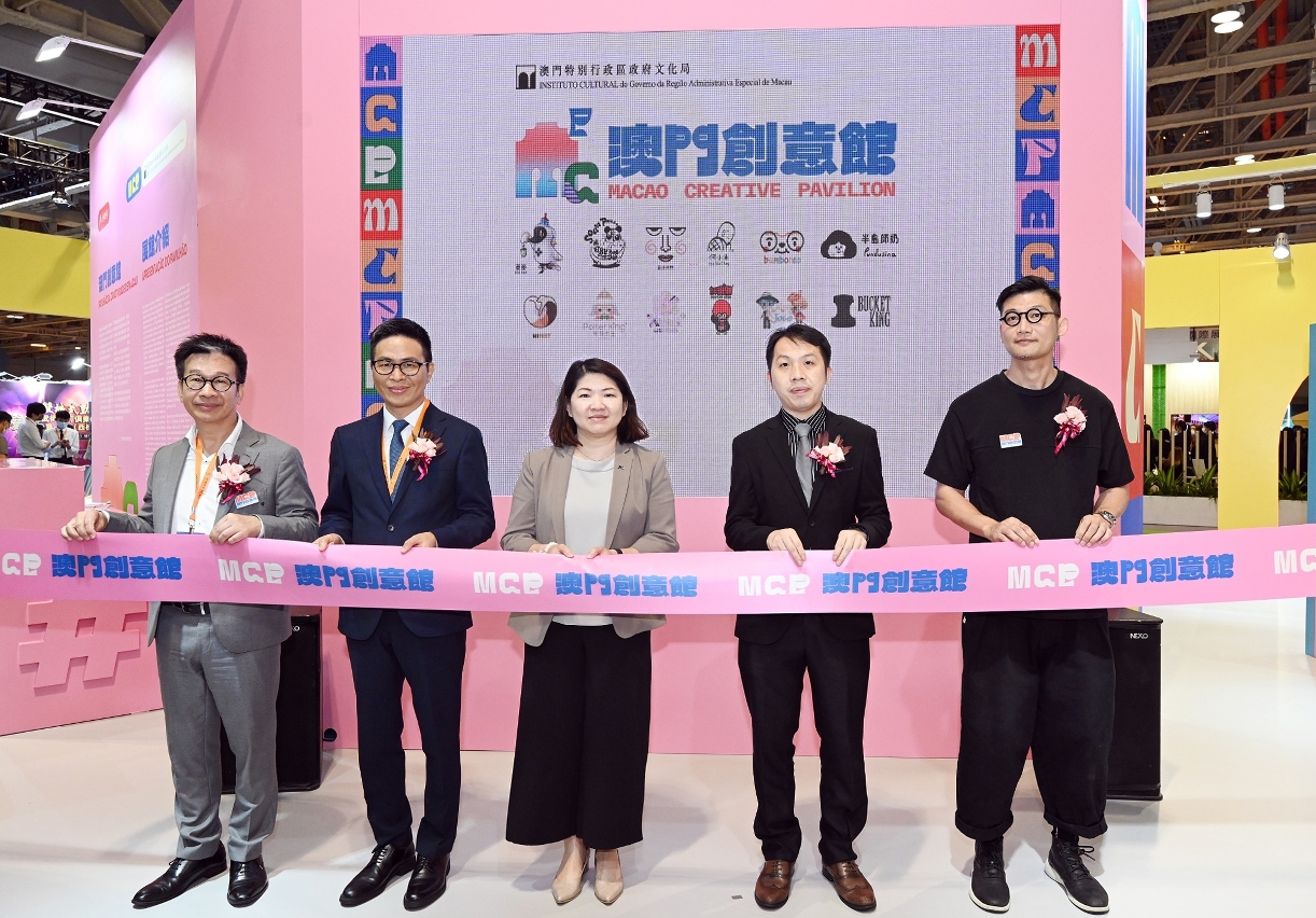 The opening ceremony of the “Macao Creative Pavilion” was held today (30 June) and was officiated by the Vice President of the Cultural Affairs Bureau of the Macao SAR Government, Cheong Lai San; the Deputy Director of the Macao Government Tourism Office of the Macao SAR Government, Cheng Wai Tong; the Member of the Administrative Committee of the Cultural Industries Fund, Chan Ka Io; the representatives of participating exhibitors, Creative Director of the Soda Panda Product Design, Wilson Lam, and Creative Director of the Case Station Advertising & Planning Co. Ltd., Case Wong.