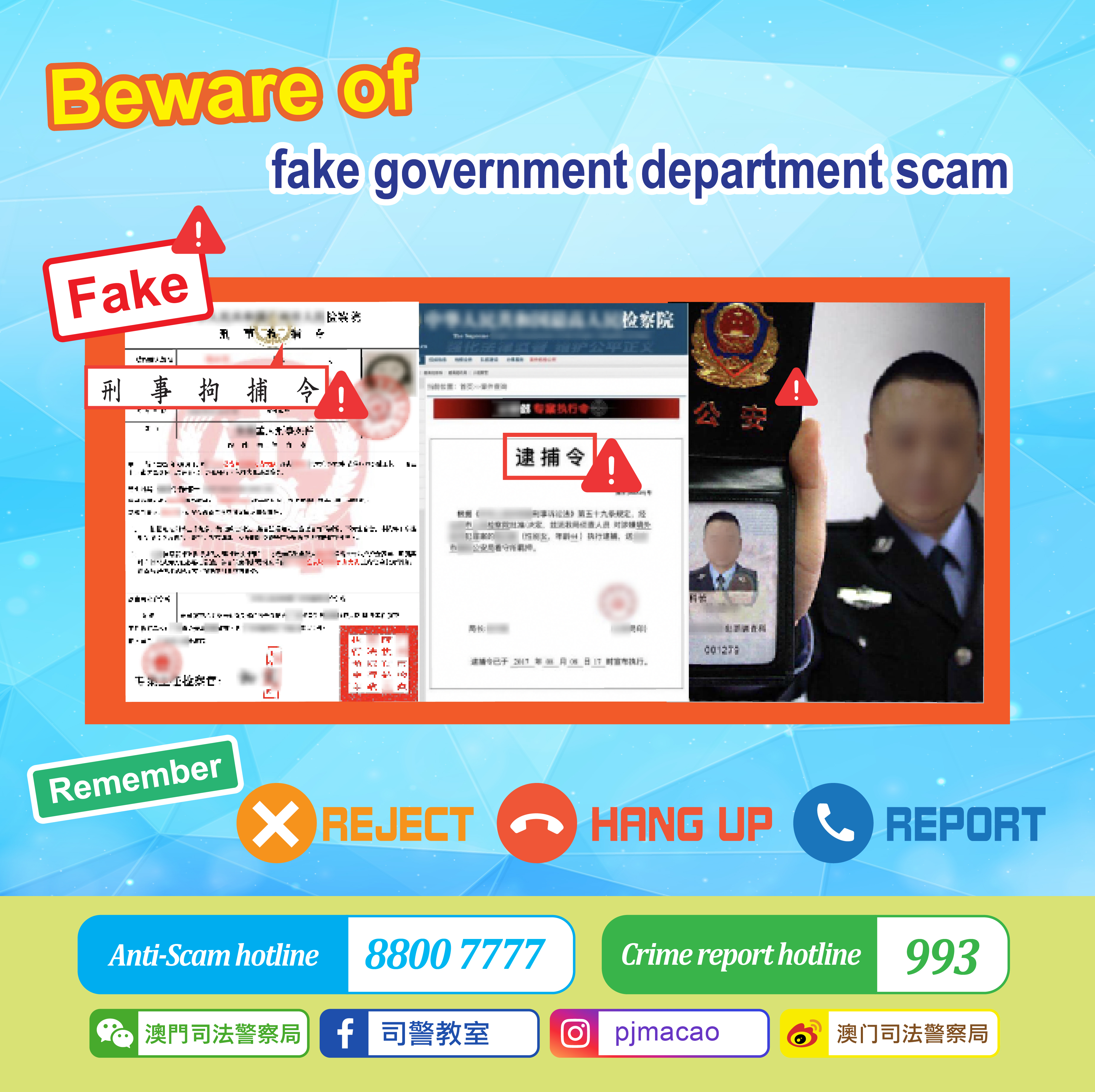 PJ once again advises the public to be alert and never readily trust people who call, saying they are representatives from government departments. Also, refrain from clicking unknown links; when asked to submit personal or bank information, always "reject" and "hang up." Should you get suspicious calls or have been defrauded, regardless of whether you have suffered loss, always contact the Judiciary Police's Anti-scam hotline at 88007777 or the crime report hotline at 993 for assistance.