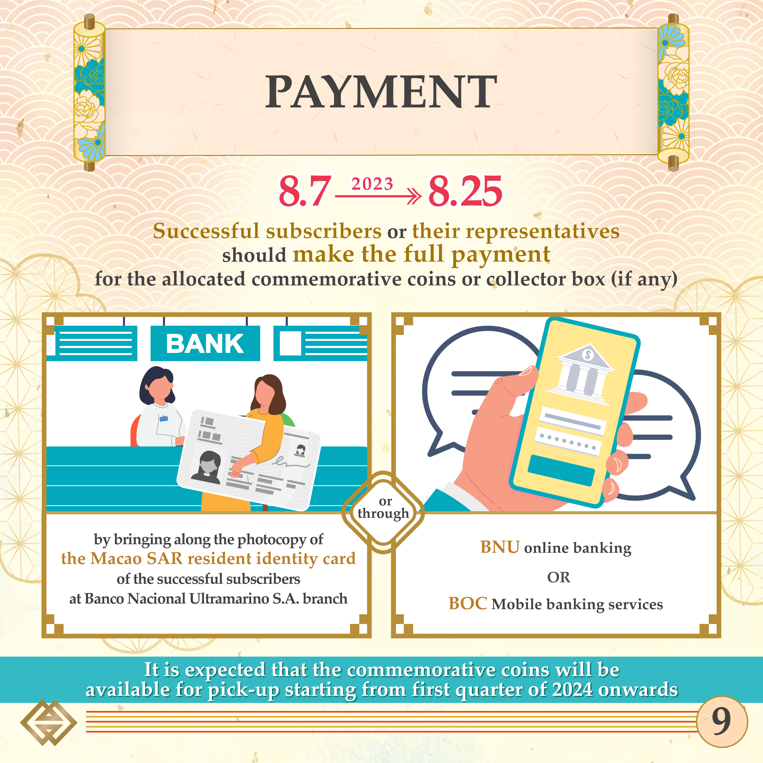 Successful subscribers or their representatives should make the full payment for the allocated commemorative coins or collector box (if any) between 7 August and 25 August 2023, by bringing along the photocopy of the Macao SAR resident identity card of the successful subscribers at Banco Nacional Ultramarino S.A. branch, or through BNU online banking or BOC Mobile banking services. It is expected that the commemorative coins and collector box will be available for pick-up starting from first quarter of 2024 onwards. For further details relating to the online registration and subscription procedures, please refer to our webpage or call 28565071 / 28565072.