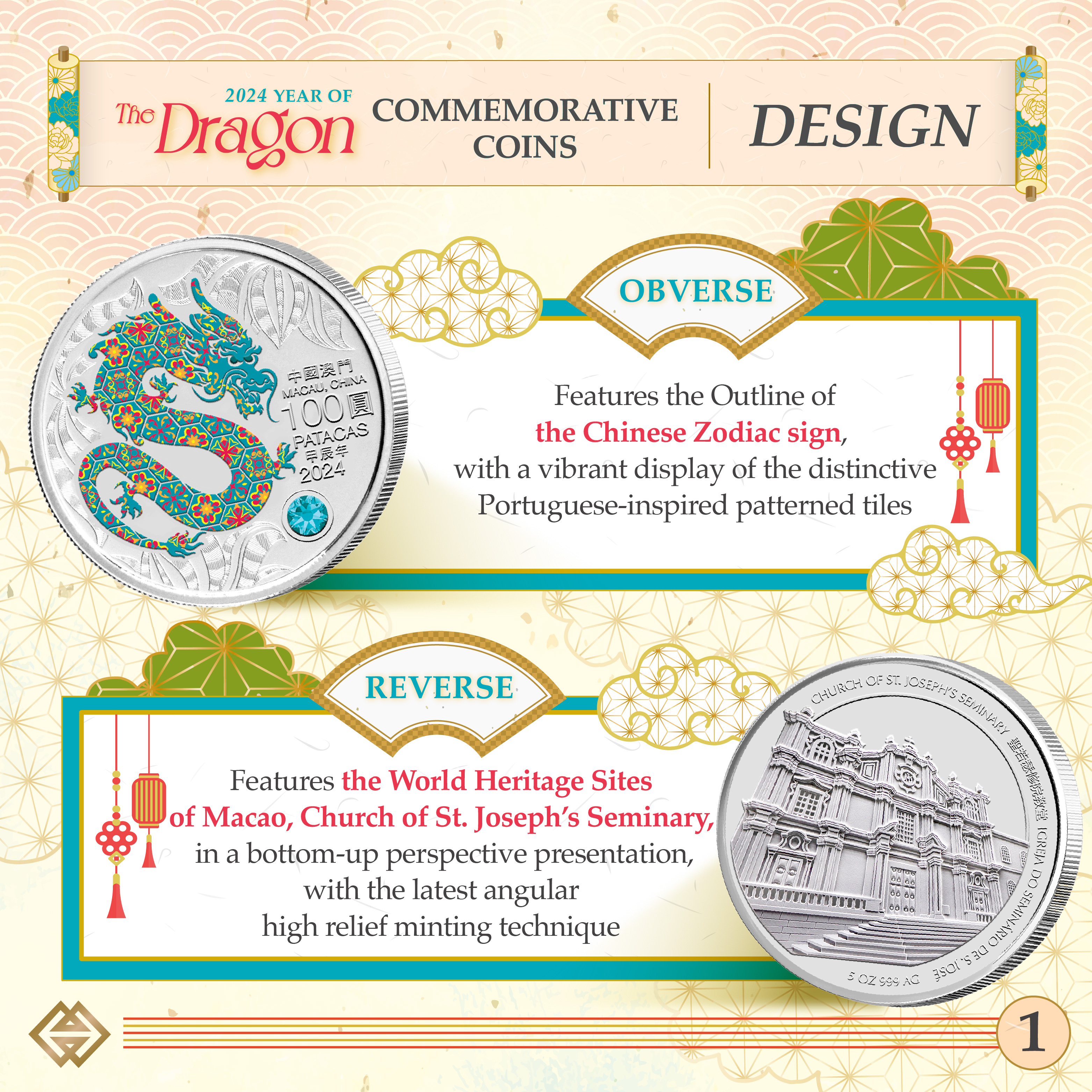 The obverse design of 2024 Year of the Dragon commemorative coins features the outline of the Chinese Zodiac sign, portrayed with a vibrant display of the distinctive Portuguese-inspired patterned tiles. The reverse design features the World Heritage Site of Macao, Church of St. Joseph’s Seminary, in a bottom-up perspective presentation, sculpted in the latest angular high relief minting technique. The Year of the Dragon commemorative coins comprise a 1 oz and a 5 oz Silver Proof coin as well as a 0.5 oz Gold Proof coin. The selling price of the coins is MOP1,380, MOP8,000 and MOP16,500 respectively.