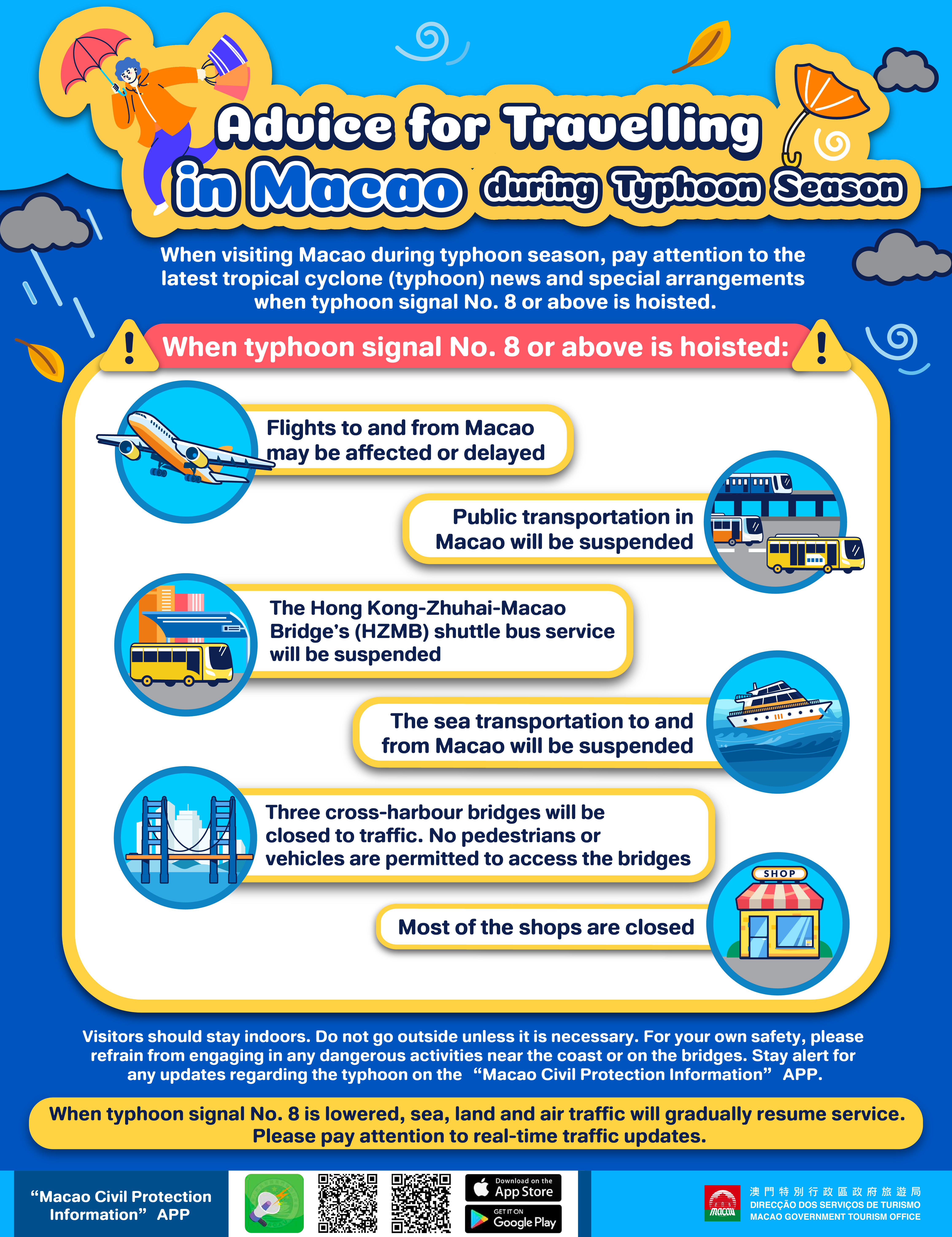 As Macao has entered typhoon season, Macao Government Tourism Office (MGTO) continues to remind tourists to pay attention to typhoon news and related matters through different channels, including bridge access, harbour and transportation service arrangements, as well as precautionary publicities to tourists visiting Macao during the typhoon season, via infographic and promotional video, and continues to optimize the distribution of typhoon news and enhance the travel experience of tourists.