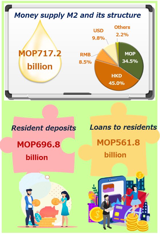 Currency in circulation and demand deposits dropped 1.3% and 3.3% respectively. M1 thus retreated 2.7% from one month earlier. On the other hand, quasi-monetary liabilities rose 0.9%. The sum of these two items, i.e. M2, rebounded 0.5% to MOP717.2 billion. On an annual basis, M1 fell 2.7% whereas M2 grew 5.5%. The shares of pataca (MOP), Hong Kong dollar (HKD), renminbi (RMB) and United States dollar (USD) in M2 were 34.5%, 45.0%, 8.5% and 9.8% respectively.