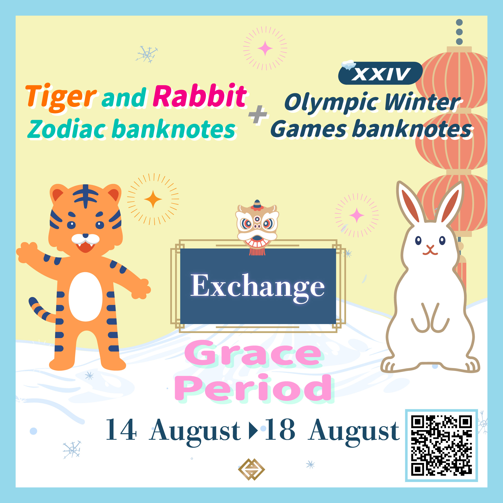 As scheduled, the exchange period for the Tiger and Rabbit Zodiac banknotes and the previously issued XXIV Olympic Winter Games banknotes will end on 11 August 2023 (Friday). For the convenience of those registrants who have not yet conducted the note exchange, a grace period will be granted between 14 August 2023 and 18 August 2023 to allow for the exchange of their subscribed notes at their previously selected bank.